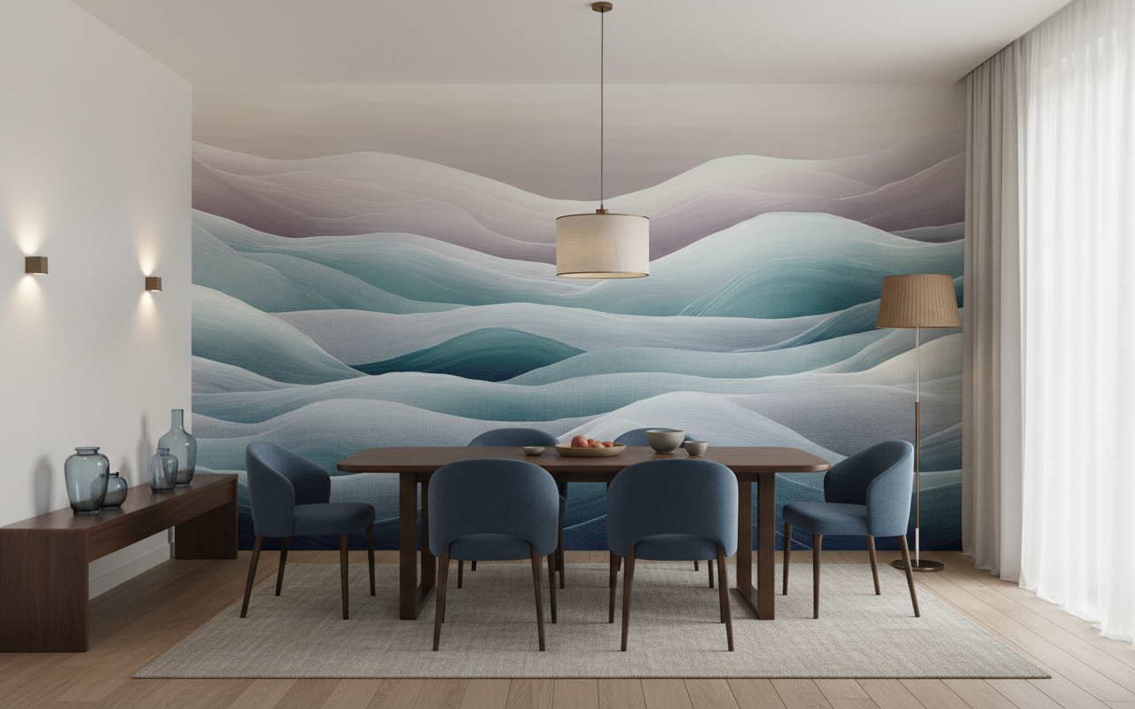 Laissez-vous porter par les ondulations vaporeuses de ce papier peint abstrait, où les vagues translucides se déploient dans un ballet silencieux, créant une symphonie visuelle d’une élégance intemporelle.