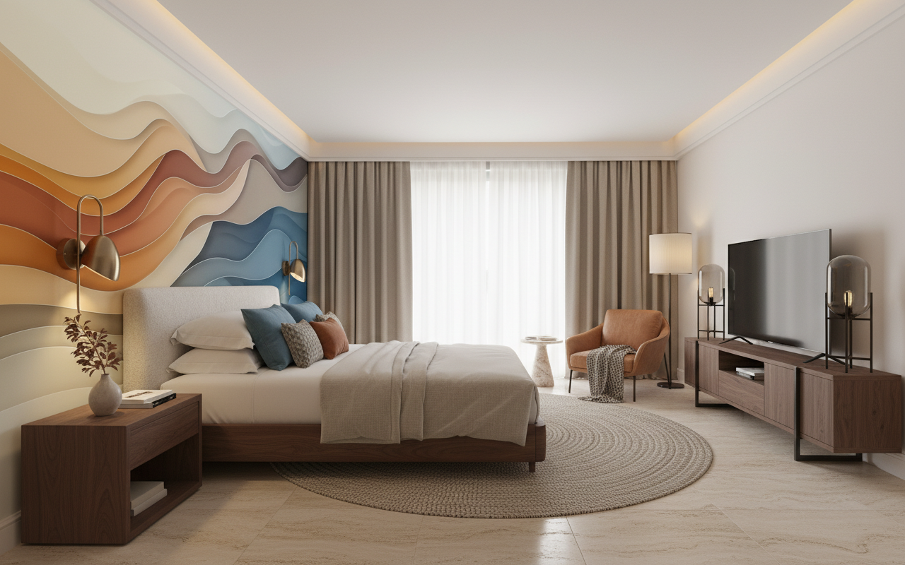 Ce papier peint design trouve naturellement sa place dans un salon contemporain en tant que mur d’accent derrière un canapé aux lignes épurées, ou dans une chambre parentale pour créer une tête de lit spectaculaire. Il sublime également un bureau moderne ou un espace détente, apportant une touche d’élégance sans ostentation. Associez-le à du mobilier en bois clair type chêne ou frêne, à des textiles en lin naturel ou en velours côtelé dans les tons neutres. Les accessoires en laiton brossé ou en céramique artisanale viendront parfaitement compléter cette ambiance scandinave chic ou mid-century modern. Pour accentuer l’effet cocooning, optez pour un éclairage indirect avec des suspensions design aux formes organiques.
