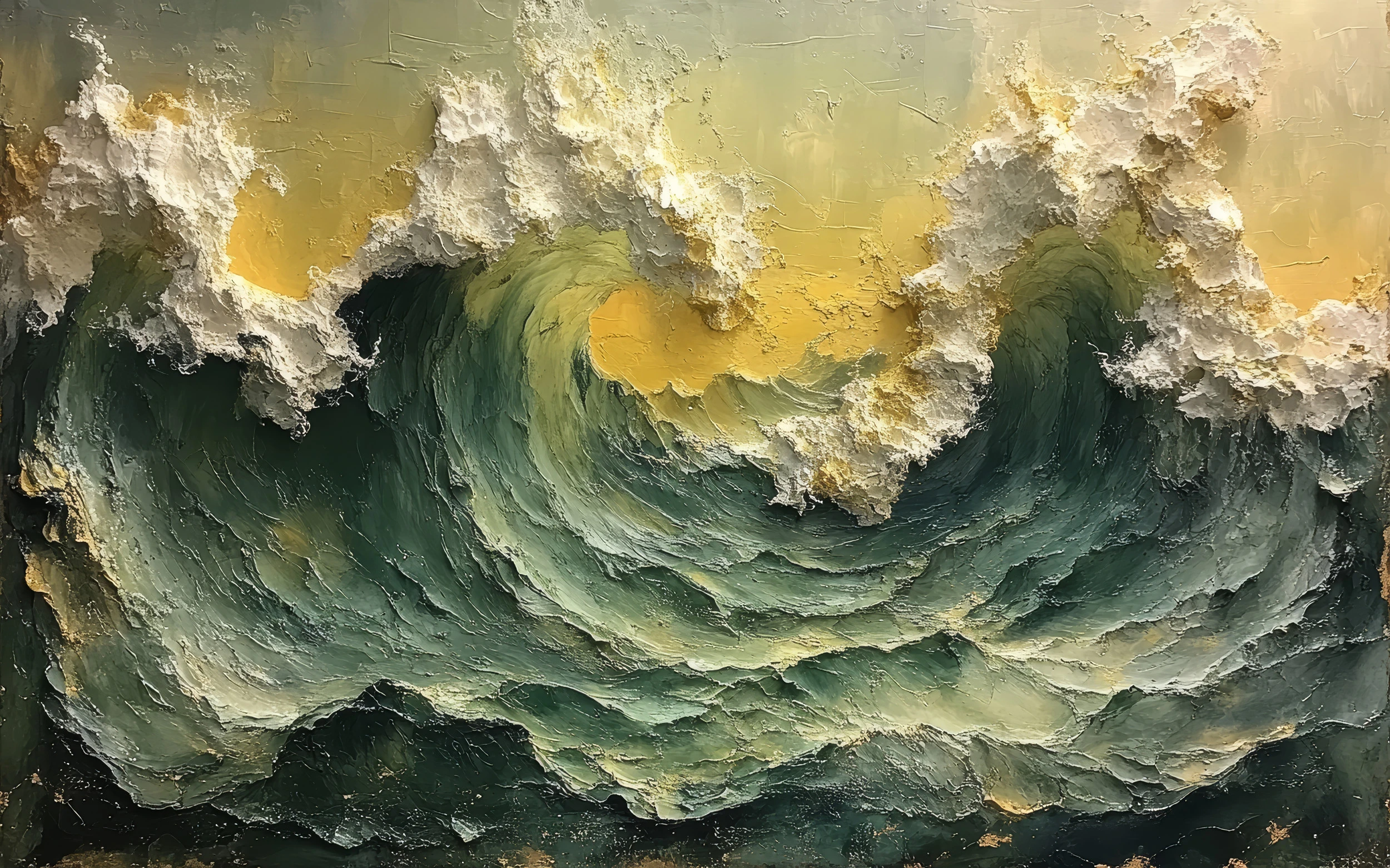 Ce papier peint océan révèle un paysage marin d’une intensité saisissante, orchestré par des vagues monumentales aux crêtes écumantes qui s’élancent vers un ciel dramatique. La technique picturale évoque une peinture à l’huile texturée, où chaque coup de pinceau sculpte la matière avec une générosité tactile remarquable. Les empâtements épais donnent vie à l’eau en mouvement, créant un relief saisissant qui accroche la lumière naturelle. La palette chromatique se déploie dans des tons verts profonds et bleus océaniques, sublimés par des nuances dorées et des blancs éclatants de l’écume. Cette symphonie de couleurs marines évoque les plus belles tempêtes romantiques, entre puissance et beauté sauvage.