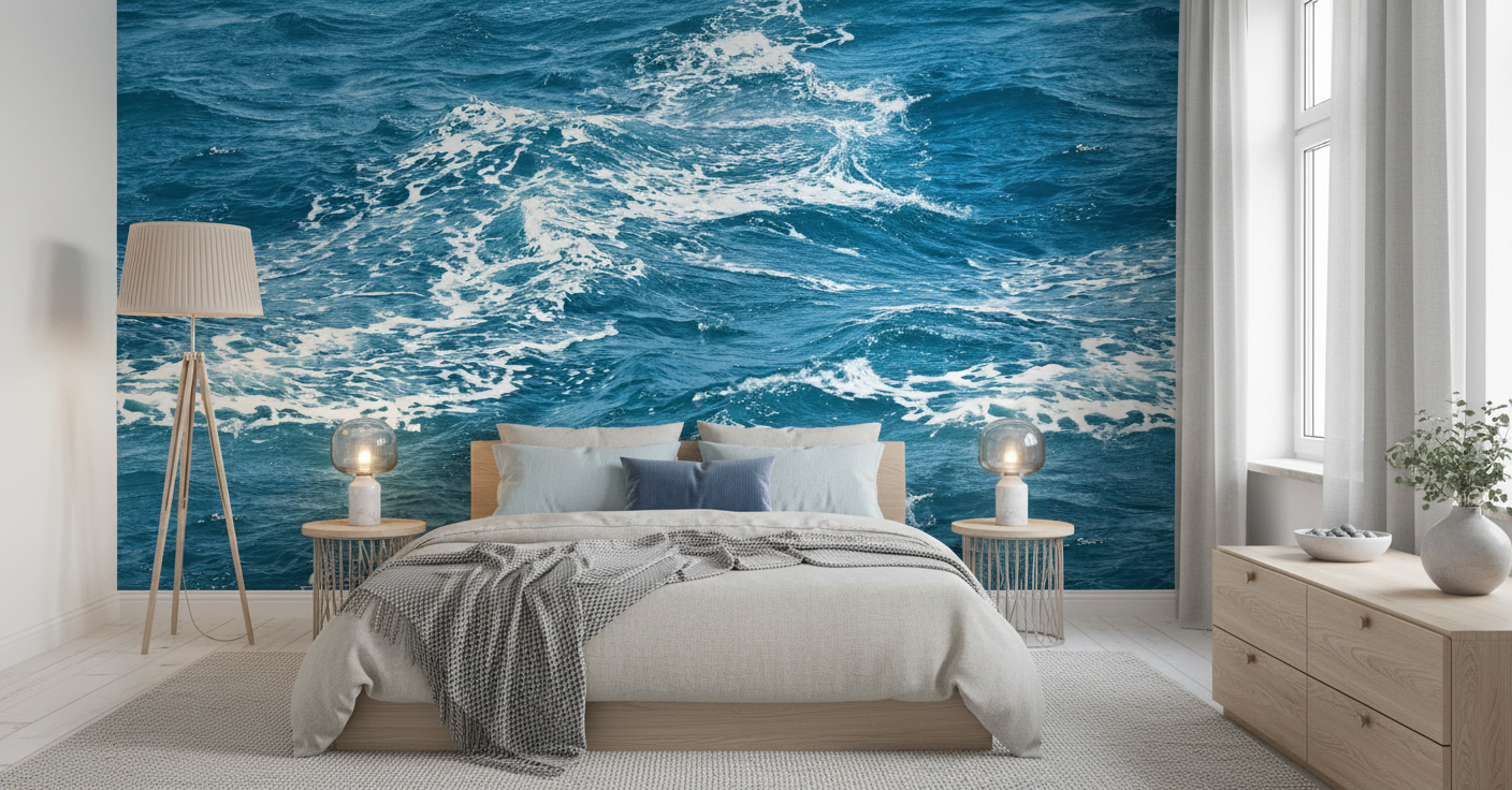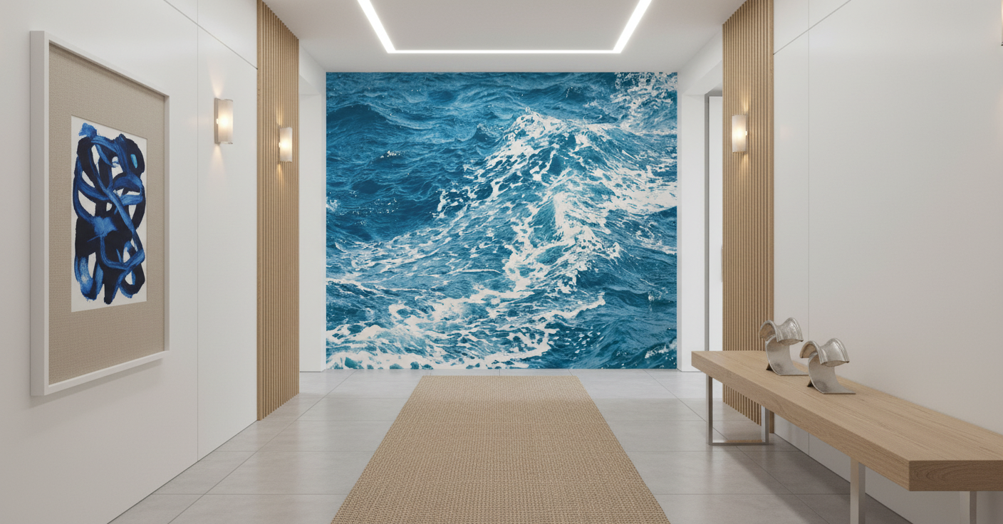 Pour une décoration bord de mer chic, complétez cette fresque murale avec des éléments naturels comme des galets, du corail blanc et des plantes grasses. L’éclairage indirect révélera toute la profondeur des nuances azur et sublimera les reflets nacré de l’écume.