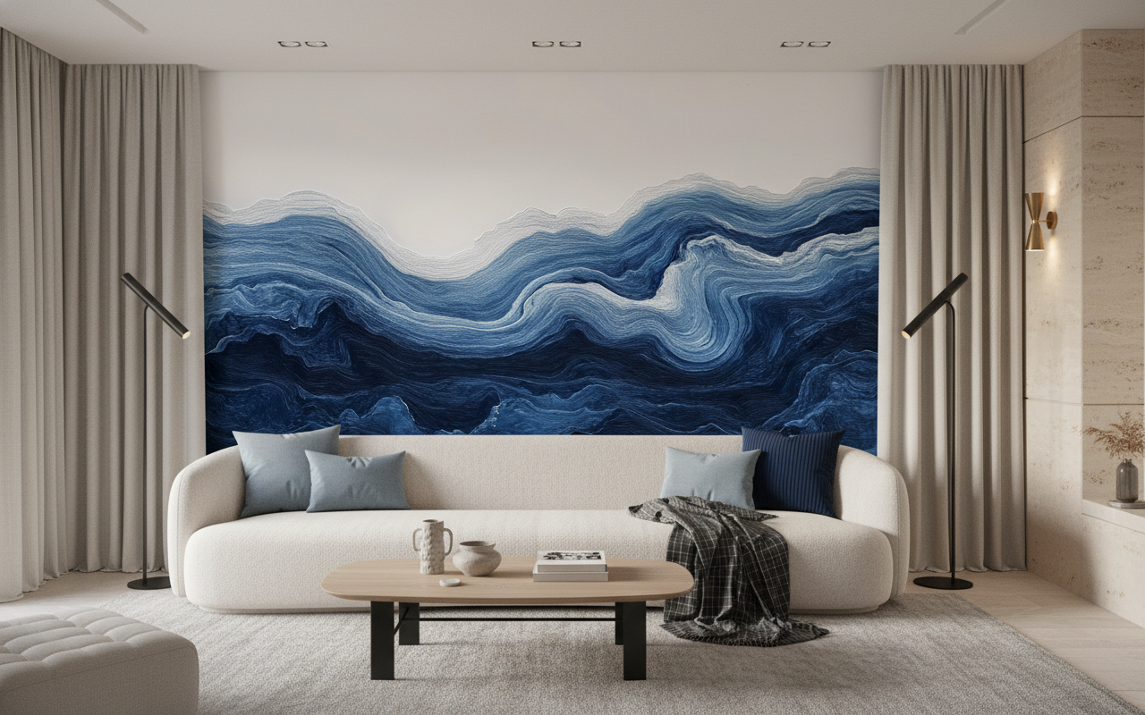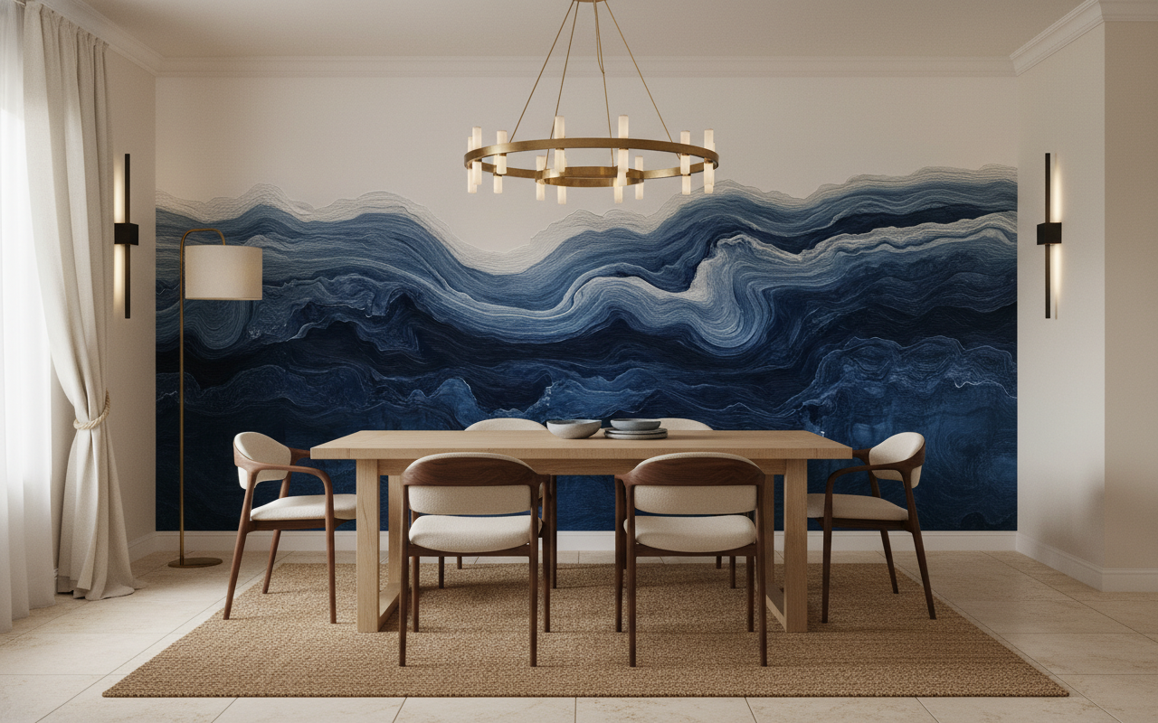 Côté associations déco, ce revêtement mural artistique se marie magnifiquement avec des matières naturelles comme le rotin tressé, le lin froissé et les fibres végétales. Pensez à l’accompagner de touches de laiton patiné ou de cuivre oxydé pour réchauffer l’ensemble, et d’éléments décoratifs dans les tons blanc cassé, beige sable ou gris galet. Des plantes aux feuillages graphiques comme les palmiers ou les fougères compléteront parfaitement cette ambiance bord de mer chic.