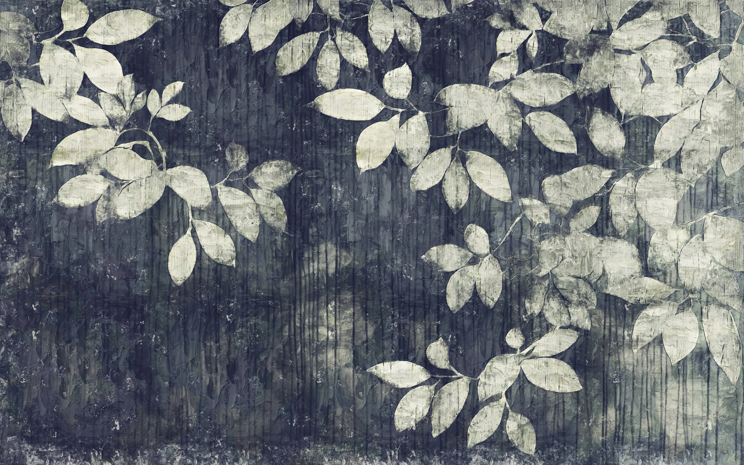 La palette chromatique joue sur un camaïeu de gris anthracite et de beiges poudrés, ponctuée de nuances bleutées qui apportent une profondeur saisissante. Ces tons naturels intemporels créent un effet de matière authentique, rappelant les enduits anciens et les patines du temps. Les feuilles aux contours nets se détachent avec délicatesse du fond strié, offrant un contraste subtil entre la douceur végétale et la rugosité minérale.
