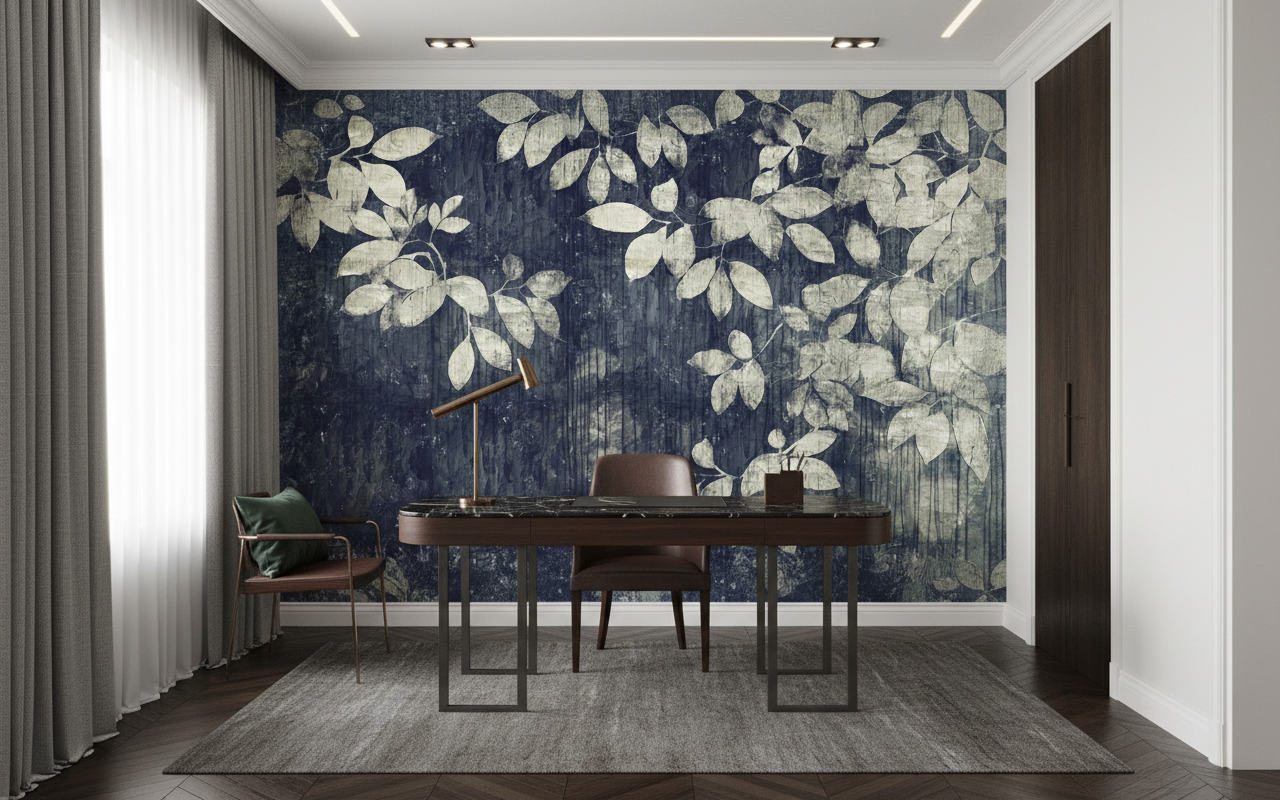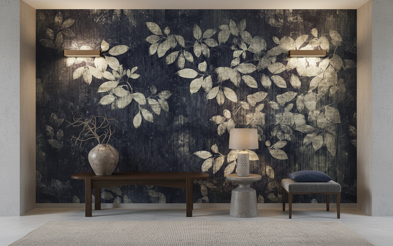 Papier peint vintage feuillage beige sur fond bleu marine texturé