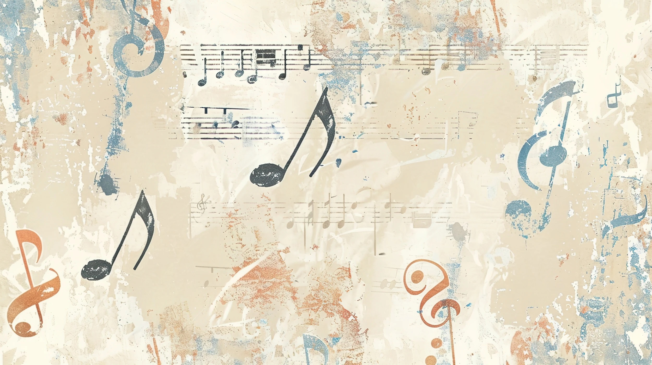 Ce papier peint musical vintage révèle un fascinant assemblage de partitions anciennes et de notes de musique dispersées dans un équilibre parfait entre ordre et improvisation. Les clés de sol élégantes côtoient des croches noires expressives, tandis que des portées musicales délavées créent une trame subtile en arrière-plan. L’ensemble adopte une esthétique grunge raffinée, où les tons beiges patinés se marient harmonieusement aux nuances ocre et aux touches bleues délavées. Cette palette chromatique évoque le charme des manuscrits anciens et des partitions d’époque, conférant à ce revêtement mural un caractère authentiquement rétro.
