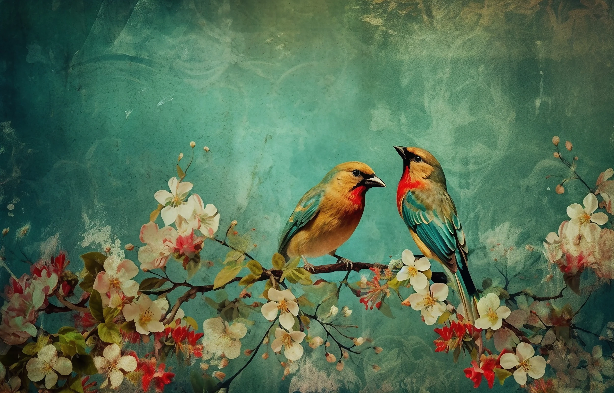 Laissez-vous envoûter par cette symphonie visuelle où deux oiseaux exotiques aux plumages chatoyants se posent délicatement sur une branche fleurie, dans un ballet de couleurs qui éveille tous les sens.