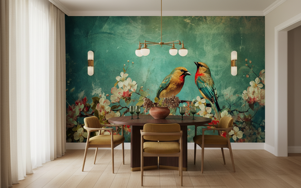 Parfait pour habiller un mur d’accent dans votre salon ou votre chambre parentale, ce papier peint oiseaux s’épanouit également dans un bureau ou une bibliothèque, apportant une touche d’inspiration créatrice. Il s’harmonise merveilleusement avec du mobilier en bois naturel, des textiles en lin écru ou velours émeraude, et des accessoires en laiton vieilli. Pour accentuer son caractère poétique, associez-le à des luminaires dorés et des plantes vertes aux feuillages généreux.