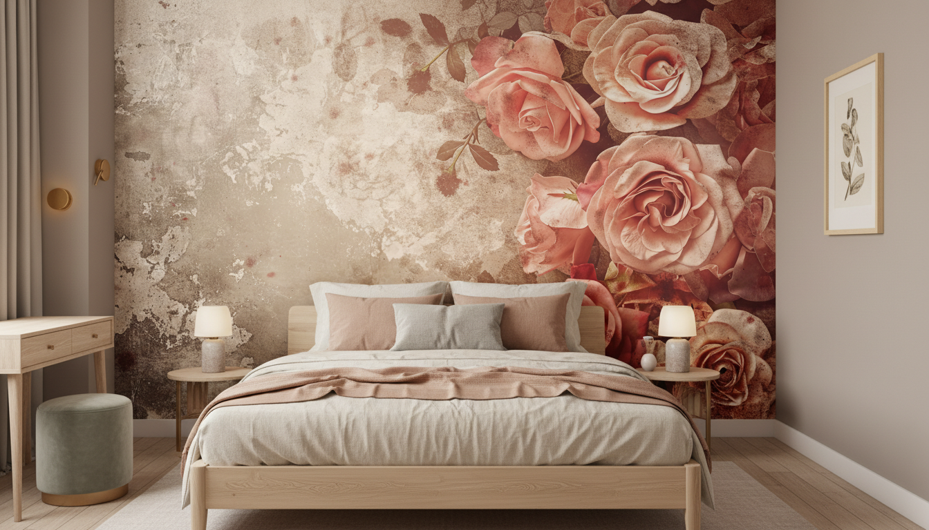 Cette création artistique révèle un bouquet de roses aux teintes poudrées, oscillant entre le rose poudré, le corail délicat et les nuances cuivrées d’un coucher de soleil automnal. Les fleurs stylisées se déploient avec une grâce naturelle sur un fond texturé beige aux accents vieillis, évoquant le charme d’une fresque murale ancienne. L’effet aquarelle vintage confère à chaque pétale une transparence subtile, tandis que les taches artistiques et éclaboussures parsemées créent une authenticité bohème saisissante. Ce motif floral romantique conjugue avec brio l’élégance intemporelle des roses classiques et l’esthétique contemporaine du style shabby chic.
