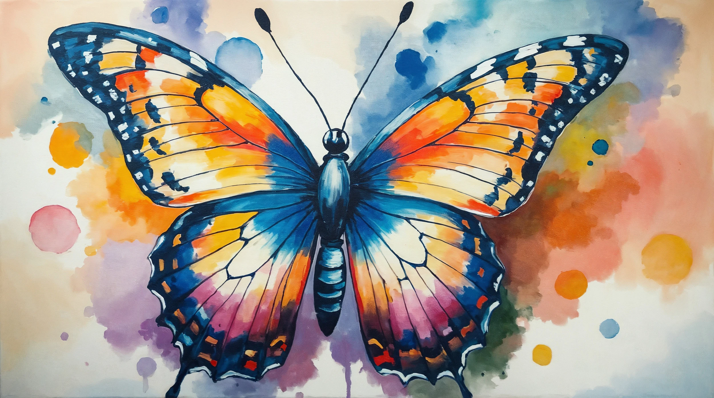 Ce papier peint artistique sublime révèle un magnifique papillon aux nuances flamboyantes, peint dans un style aquarelle d’une délicatesse saisissante. Les ailes majestueuses se parent d’un dégradé somptueux allant du bleu cobalt profond aux oranges chaleureux, en passant par des jaunes dorés et des roses poudrés. Les détails minutieux des nervures et des motifs géométriques typiques du monarque créent un contraste saisissant avec les éclaboussures colorées qui auréolent cette créature d’exception. L’arrière-plan s’anime de taches d’aquarelle aux tons pastel – bleus céruléens, roses tendres, jaunes solaires – qui évoquent un ciel d’été parsemé de nuages cotonneux.