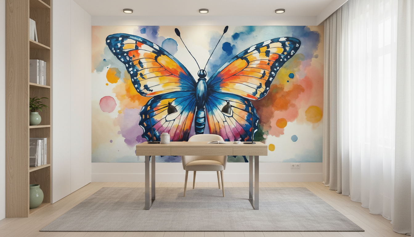 Parfaitement adapté pour habiller un mur d’accent dans un salon contemporain, ce papier peint design saura également métamorphoser une chambre parentale en sanctuaire de sérénité. Dans un bureau créatif, il stimulera l’inspiration, tandis que dans une chambre d’enfant ou d’adolescent, il éveillera l’imaginaire et la curiosité pour la beauté naturelle. Associez-le à du mobilier en bois clair pour un rendu scandinave-nature, ou optez pour des accents dorés et du velours bleu nuit pour une ambiance plus sophistiquée. Les textiles lin aux tons neutres – blanc cassé, beige naturel, gris perle – sublimeront les nuances colorées du papillon sans créer de concurrence visuelle.
