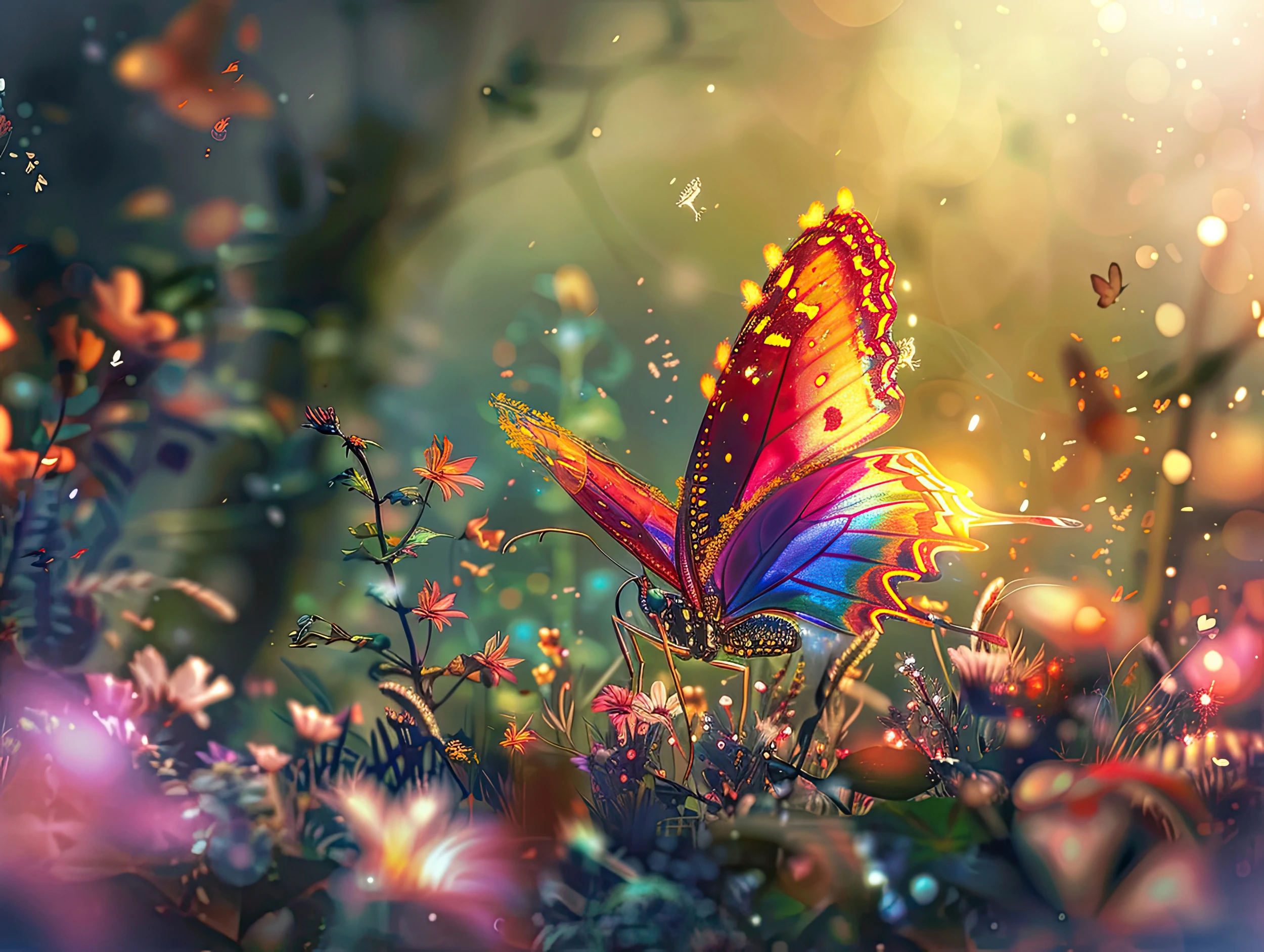 Ce papier peint fantastique dévoile un univers enchanté où un papillon aux ailes iridescentes trône majestueusement au cœur d’une prairie mystique. Ses ailes déployées révèlent un dégradé spectaculaire allant du rouge flamboyant aux bleus profonds, rehaussé de touches dorées scintillantes. L’ensemble baigne dans une lumière dorée diffuse qui fait danser des particules lumineuses dans l’air, créant un effet de bokeh artistique d’une beauté saisissante.