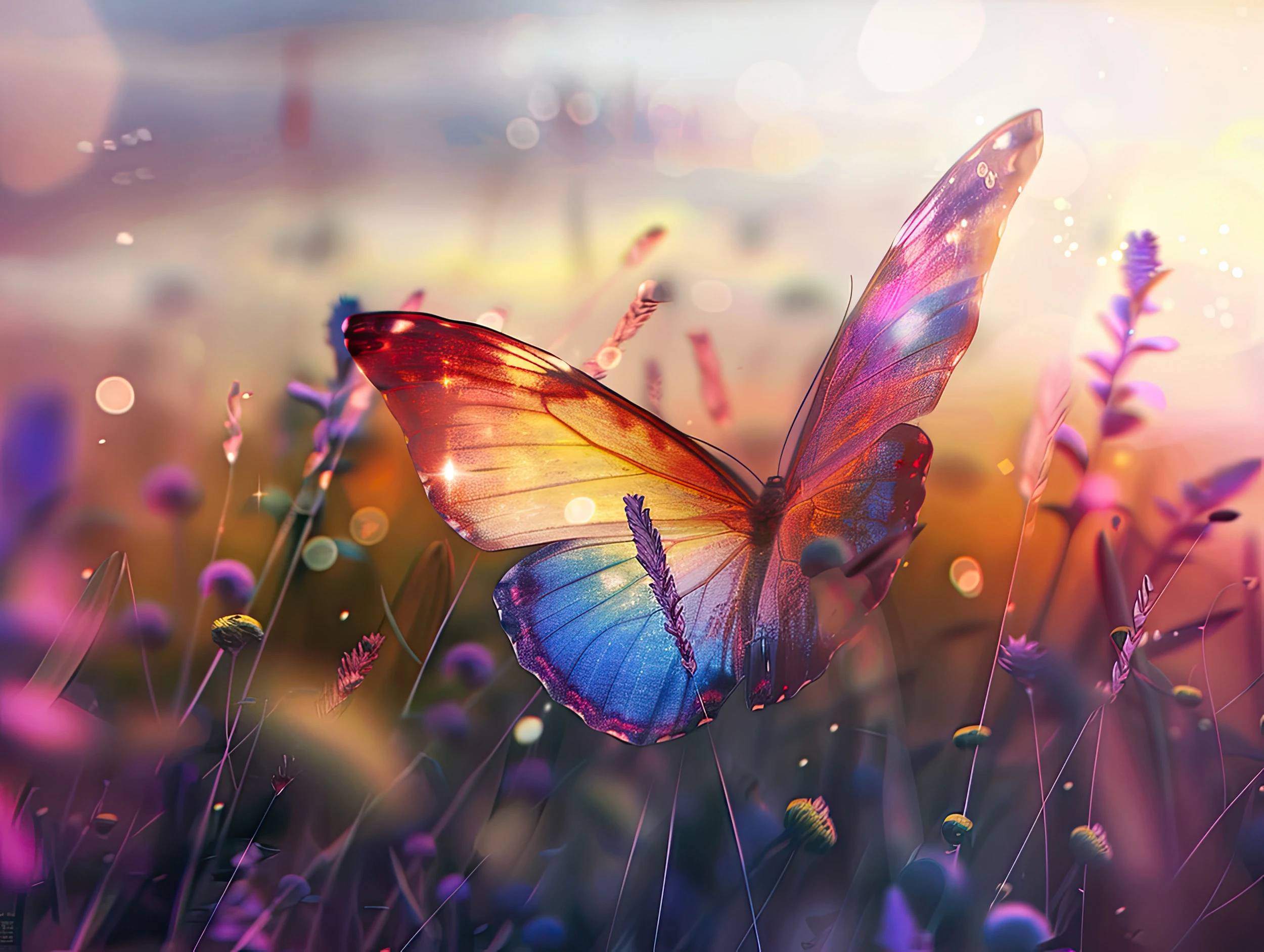 L’arrière-plan s’épanouit dans une prairie sauvage aux teintes rose poudré et lavande, où se dessinent délicatement des herbes folles et de petites fleurs champêtres. Cette composition florale crée une atmosphère de jardin enchanté, baignée d’une lumière dorée qui évoque les derniers rayons du soleil couchant. Les effets de flou artistique et les particules lumineuses dispersées dans l’air apportent une dimension féerique et onirique à l’ensemble.