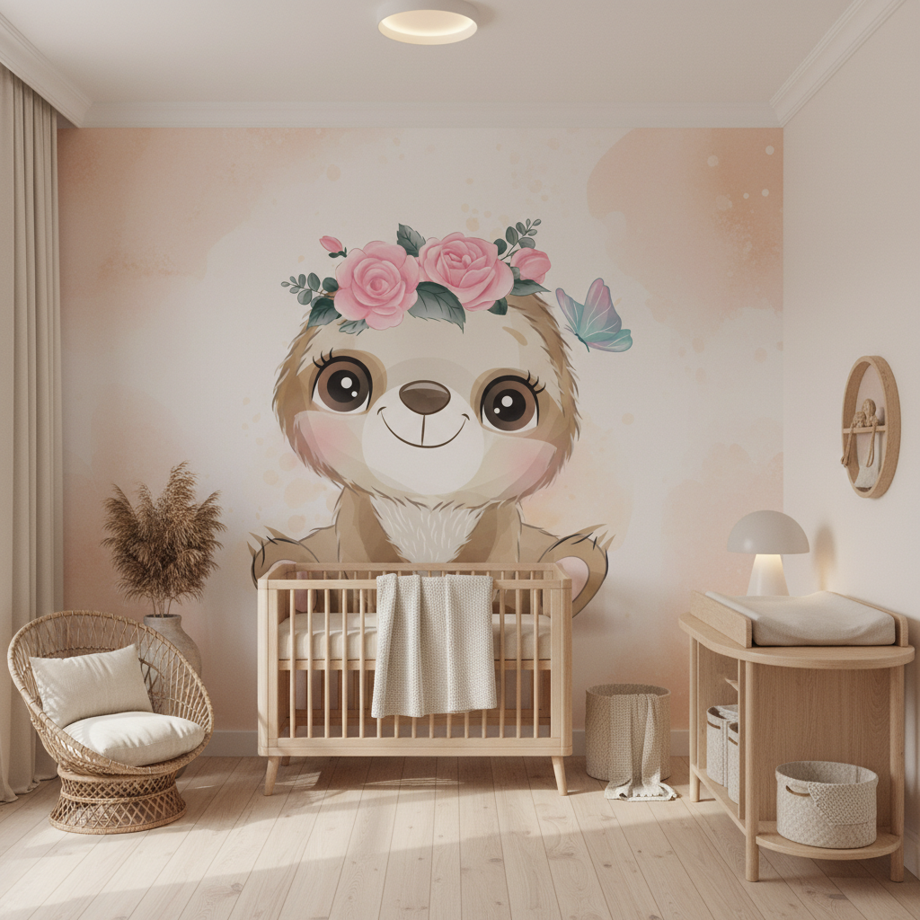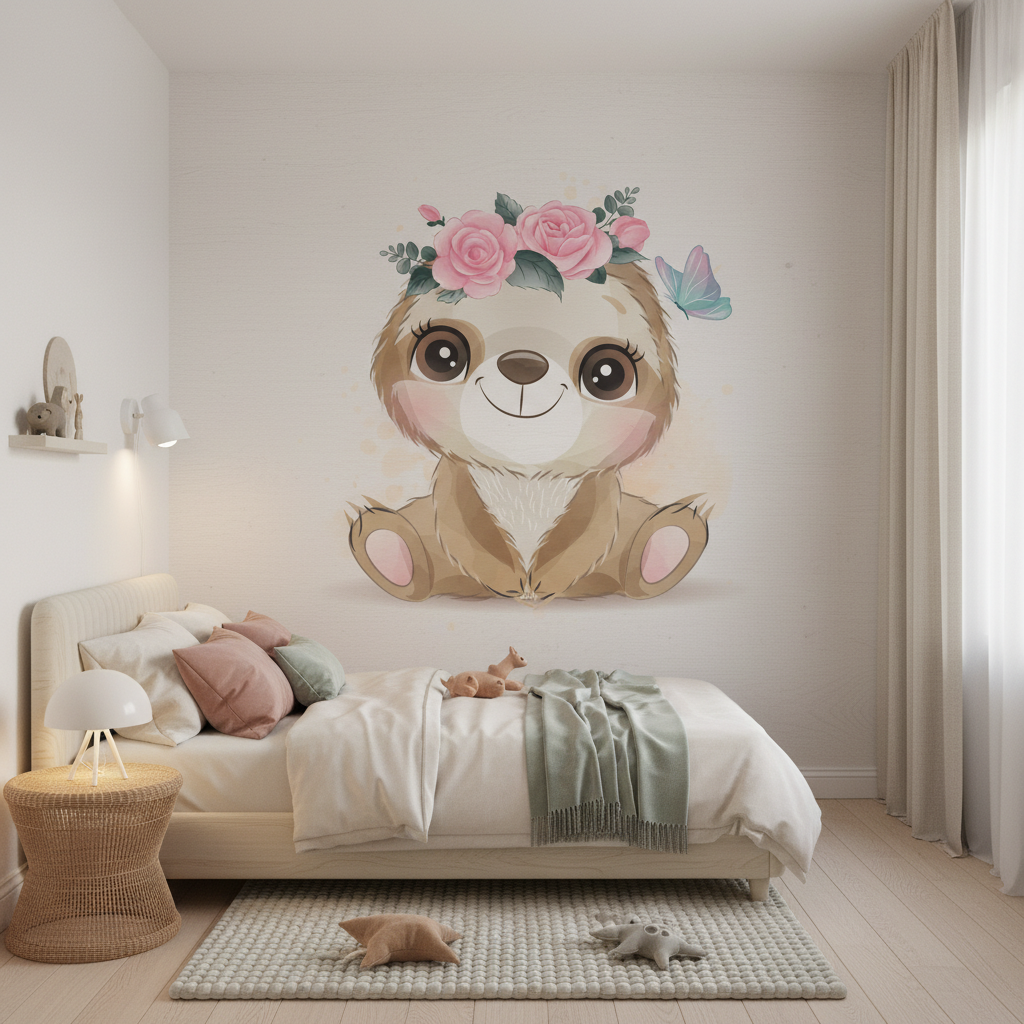 Ce papier peint enfant met en scène un adorable paresseux aux traits délicatement stylisés, paré d’une couronne de roses roses et de feuillage vert tendre qui évoque la magie des contes de fées. Son pelage beige et crème, rehaussé de nuances dorées subtiles, contraste harmonieusement avec ses grands yeux bruns pétillants de malice. Un papillon pastel virevoltant près de sa tête ajoute une note de fantaisie à cette composition enchanteresse. Le style graphique s’inspire de l’illustration aquarelle moderne, où chaque détail est traité avec une précision artistique remarquable, créant un rendu à la fois réaliste et poétique.