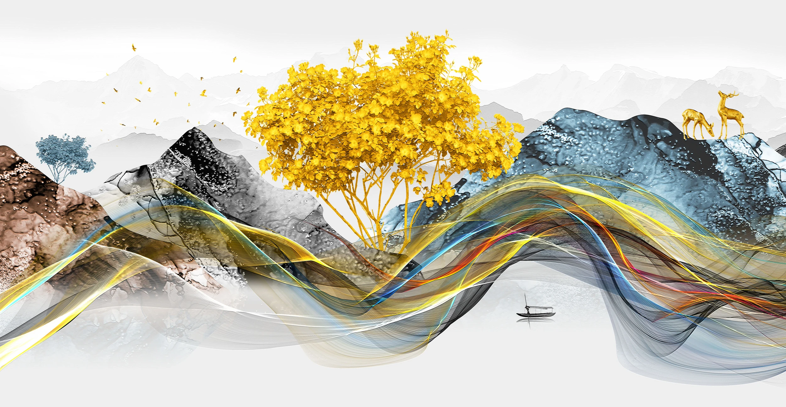 L’élément le plus fascinant réside dans ces flux colorés ondulants qui serpentent à travers le paysage tel un fleuve aérien. Ces rubans fluides déclinent une gamme chromatique raffinée alliant ocre doré, bleu céruléen, rouge vermillon et vert émeraude, créant un mouvement perpétuel qui anime la composition. Une petite embarcation solitaire navigue sur les eaux sereines, tandis que des silhouettes de cerfs se profilent élégamment sur les hauteurs rocheuses, ajoutant une dimension poétique à cette fresque murale d’exception.
