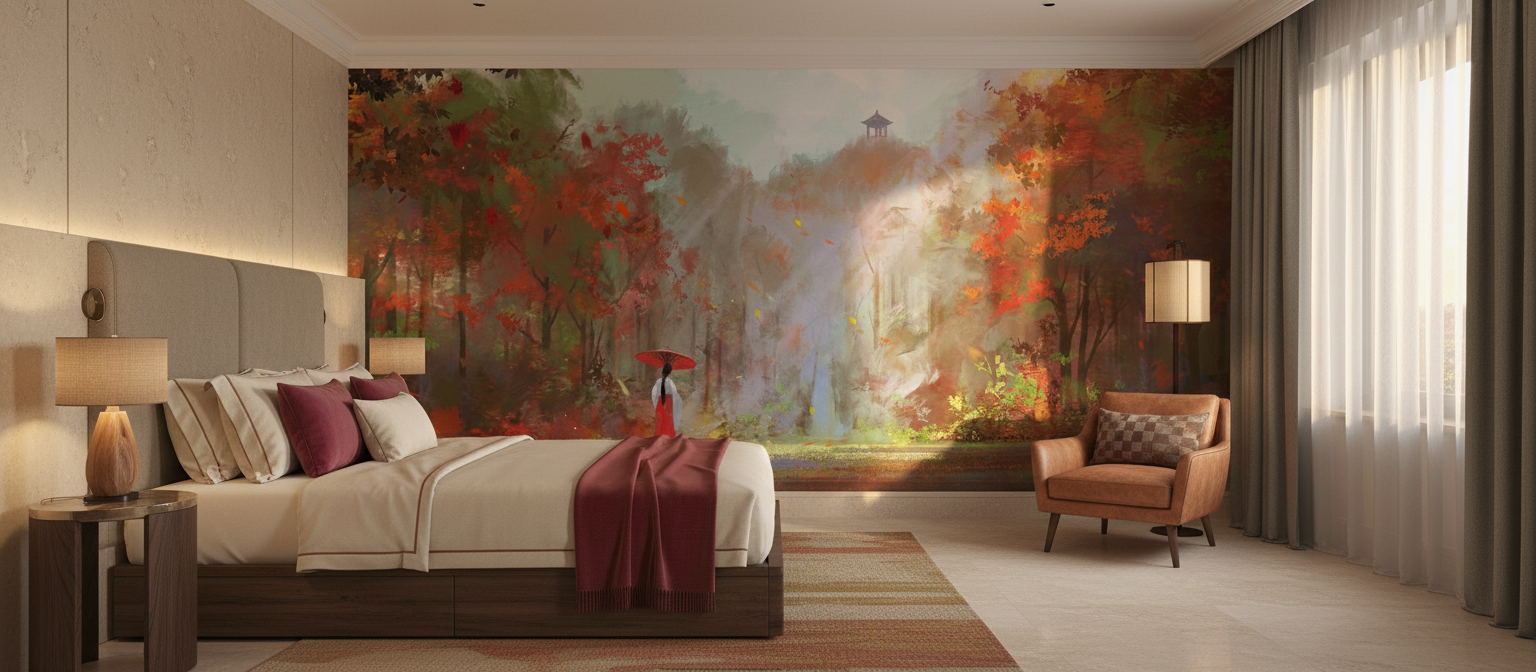 Ce papier peint artistique capture un moment d’une beauté saisissante : une silhouette élégante en kimono rouge et blanc se dresse au cœur d’une forêt d’automne japonaise, protégée par son ombrelle écarlate traditionnelle. Les érables aux feuilles flamboyantes forment une voûte majestueuse aux tons chauds de rouge vermillon, d’orange cuivré et de jaune ambré. Au loin, perchée sur une colline embrumée, une pagode traditionnelle émerge délicatement de la brume, ajoutant une dimension spirituelle et contemplative à cette composition d’inspiration asiatique.