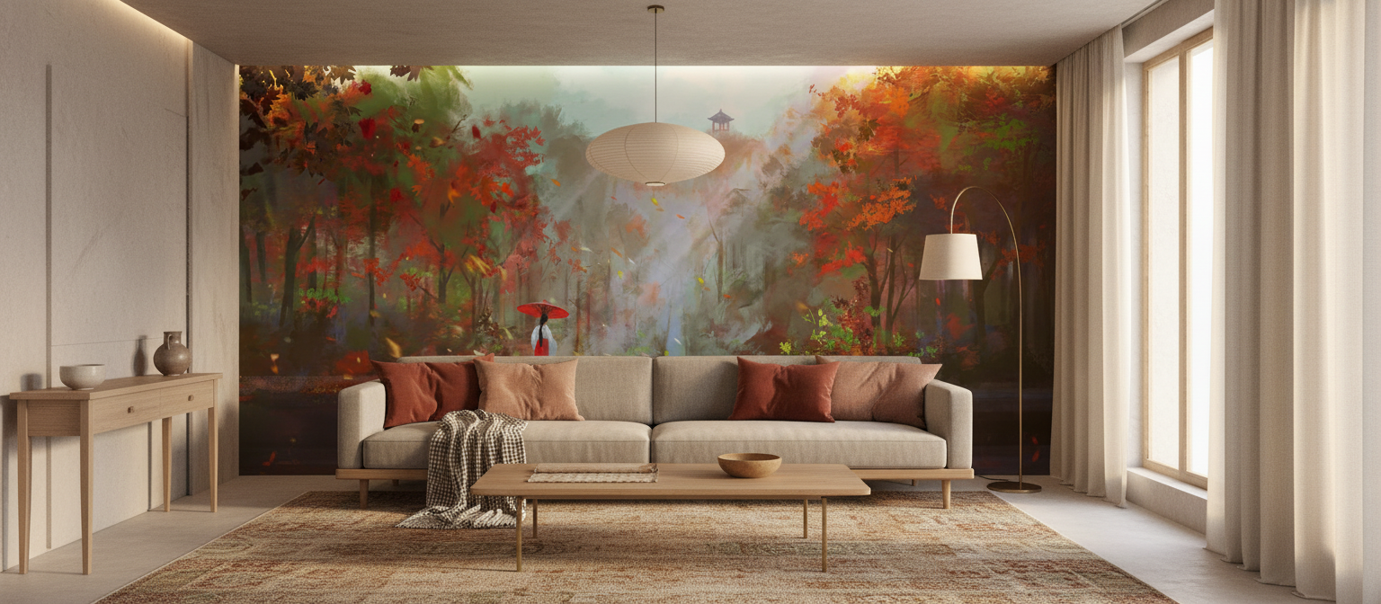 Pour un bureau zen propice à la concentration, ou un espace détente dédié au bien-être, ce papier peint devient le point focal d’une décoration inspirée des arts asiatiques. Complétez l’ambiance avec des lanternes japonaises, des coussins de méditation ou quelques branches d’érable pour faire écho aux motifs du mur.