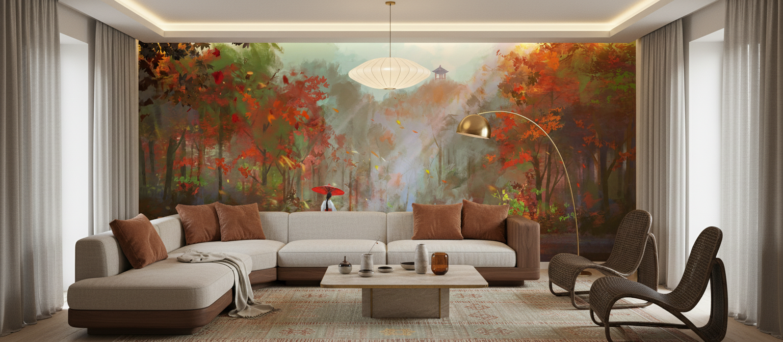Ce papier peint paysage automnal s’épanouit particulièrement dans un salon contemporain où il créera un mur d’accent spectaculaire, ou dans une chambre parentale pour instaurer une ambiance propice à la détente. Il sublimera également un bureau en apportant une dimension inspirante et apaisante. Associez-le à du mobilier en bois sombre type ébène ou wengé pour renforcer l’esthétique asiatique, ou optez pour des matières naturelles comme le bambou, le lin écru et la céramique artisanale. Les tons neutres – beige, crème, blanc cassé – magnifieront les couleurs ardentes du papier peint, tandis que des touches de laque noire ou de cuivre brossé apporteront une sophistication moderne.