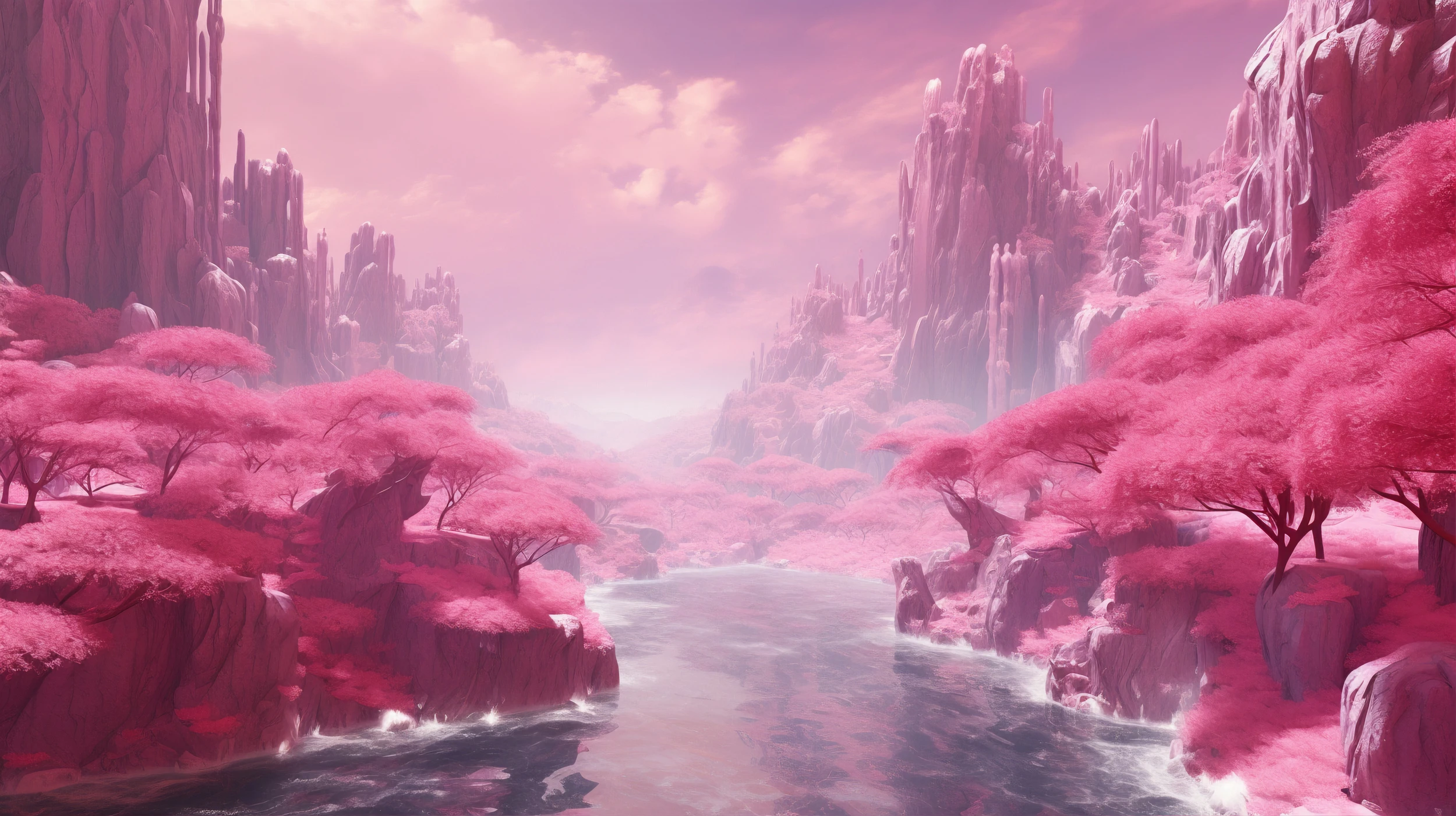 Ce papier peint paysage fantastique révèle un panorama enchanteur d’une beauté saisissante. Au premier plan, des cerisiers japonais en fleurs déploient leur canopée vaporeuse dans des tons rose fuchsia éclatants, leurs branches délicates se reflétant dans les eaux cristallines d’une rivière serpentine. L’art numérique sublime ici la nature en créant une atmosphère onirique où les montagnes roses se dressent majestueusement vers un ciel pourpre teinté de nuages cotonneux.