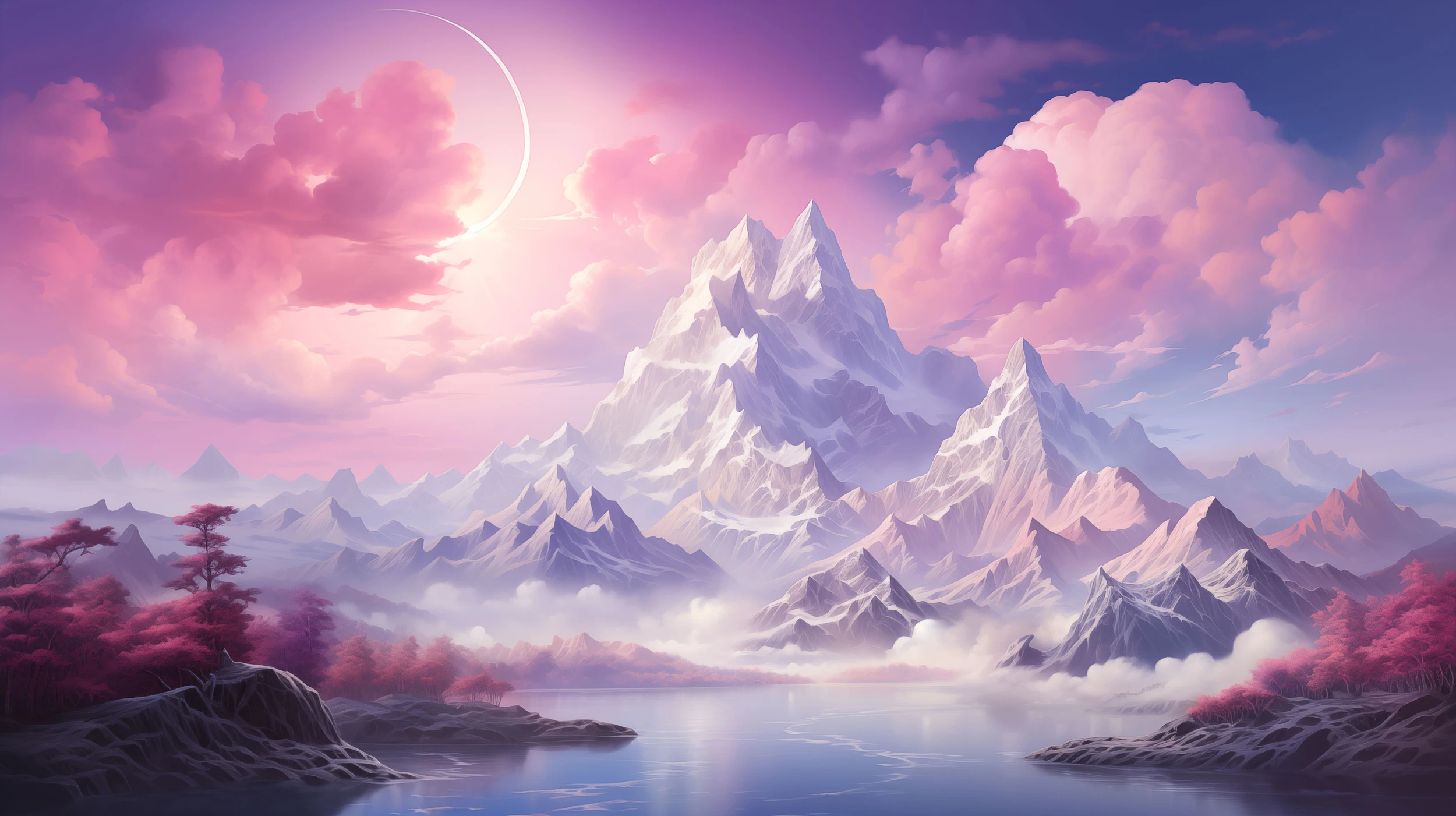 Ce papier peint paysage fantastique dévoile une composition époustouflante mêlant réalisme et onirisme. Au premier plan, un lac aux reflets miroitants s’étend paisiblement, bordé de rochers sombres et de végétation aux teintes pourpres. Les arbres, aux silhouettes délicates rappelant les cerisiers japonais, apportent une touche de romantisme oriental à cette scène grandiose. La chaîne montagneuse se dresse avec une prestance remarquable, ses pics acérés sculptés dans des tons nacrés qui contrastent harmonieusement avec le ciel violet profond.