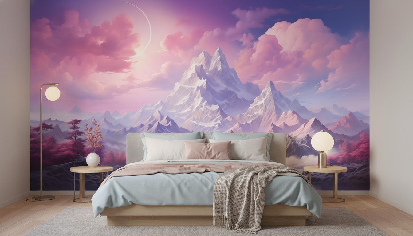 La technique artistique de ce papier peint style peinture évoque l’art de l’aquarelle numérique, avec ses dégradés subtils et ses effets de lumière d’une finesse exceptionnelle. Les nuages roses semblent flotter dans une atmosphère éthérée, tandis qu’un croissant de lune ou une planète lointaine illumine cette scène d’un halo mystique. Cette palette chromatique dominée par les violets, roses et bleus crée une symphonie colorée d’une rare élégance.