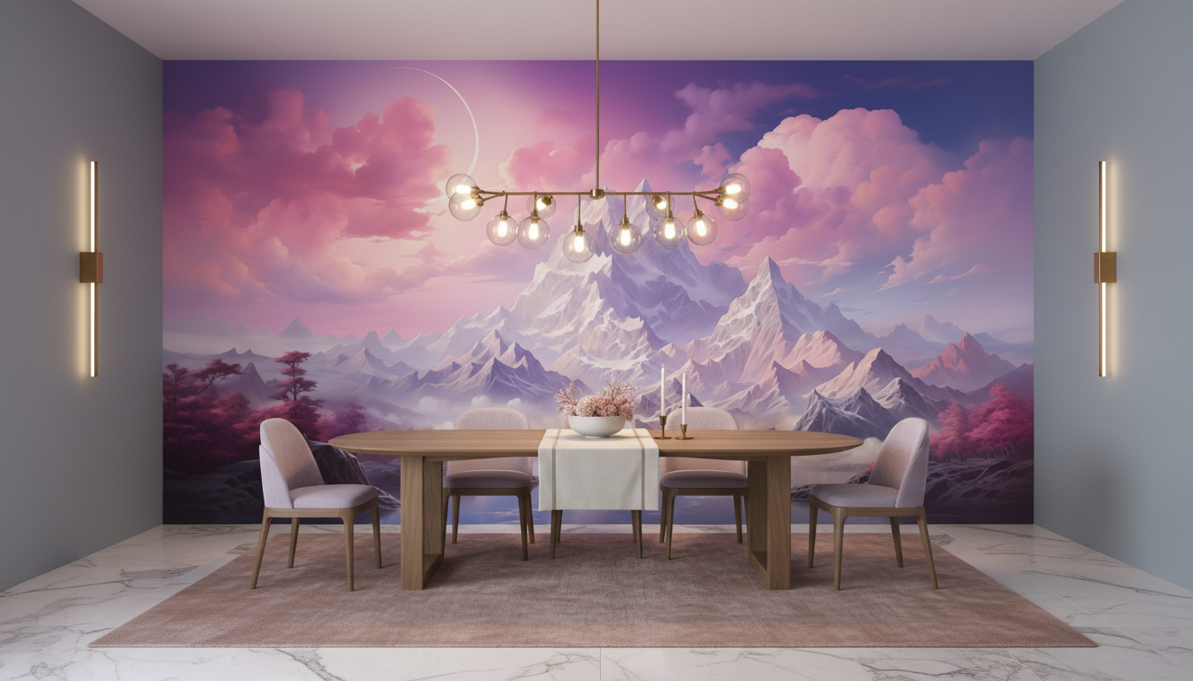 Pour sublimer ce papier peint nature fantastique, associez-le à du mobilier aux lignes épurées dans des teintes blanc cassé ou gris perle. Le bois clair, comme le chêne blanchi ou le frêne naturel, créera un contraste chaleureux. Des textiles dans les tons poudrés – rose quartz, lavande ou gris colombe – prolongeront harmonieusement la palette chromatique. Quelques objets déco dorés ou en laiton brossé apporteront des reflets précieux qui feront écho à la lumière céleste du paysage.