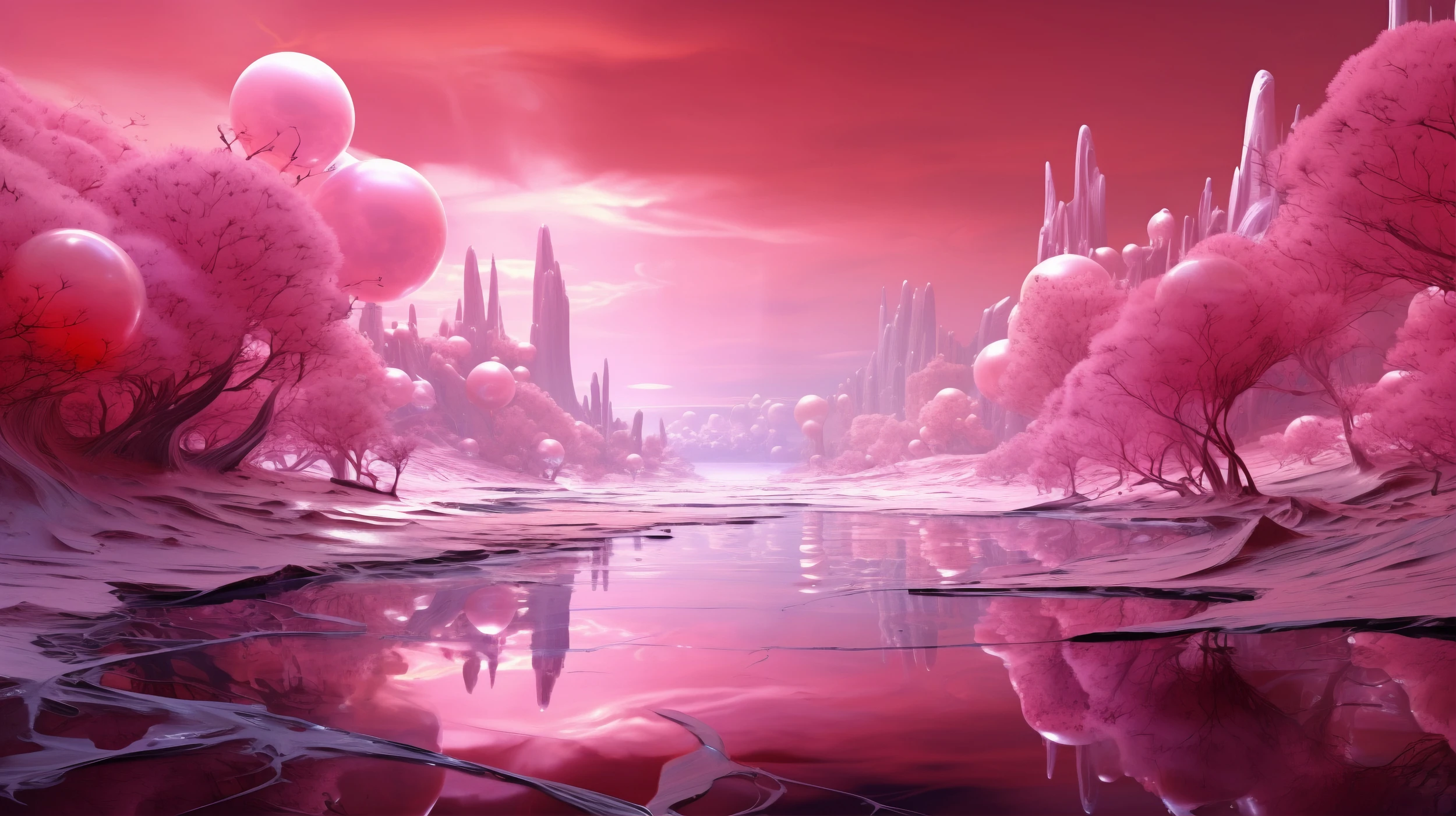 Les couleurs roses dominantes se déclinent en nuances subtiles, du rose pâle nacré au magenta profond, créant une harmonie chromatique envoûtante. Ces teintes se reflètent délicatement sur la surface d’un lac miroir, doublant la magie du paysage par ses reflets chatoyants. À l’horizon, des formations cristallines et des structures mystérieuses émergent tel un décor de conte futuriste, tandis que des sphères translucides flottent gracieusement dans cet eden imaginaire.