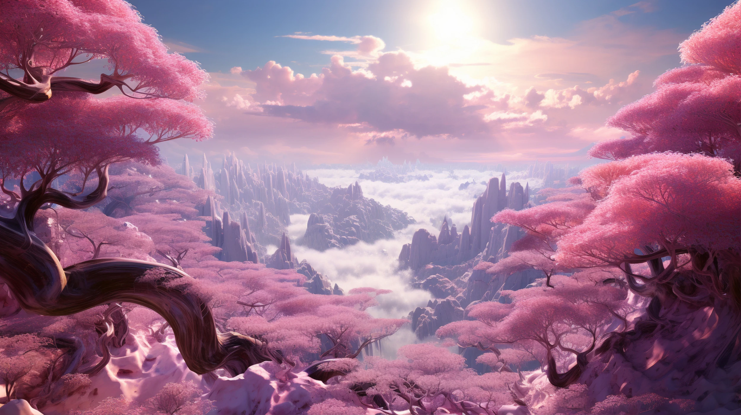 Ce papier peint paysage fantastique dévoile un monde onirique d’une délicatesse exceptionnelle. Les arbres aux feuillages rose dominent cette composition artistique, leurs branches sinueuses s’étirant gracieusement vers un ciel pastel teinté de mauve et d’or. Au cœur de cette scène, des formations rocheuses émergent d’un océan de nuages blancs, créant un effet de profondeur saisissant qui évoque les plus beaux paysages asiatiques traditionnels. Le style graphique, d’un réalisme fantastique raffiné, mêle la précision du détail à la magie de l’imaginaire, rappelant les œuvres des grands maîtres de l’art numérique contemporain.
