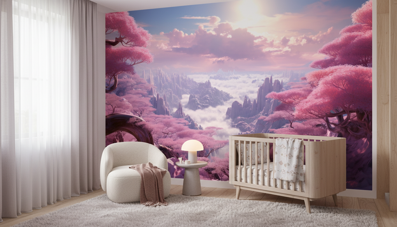 La palette chromatique rose et mauve de ce papier peint nature féerique baigne l’ensemble dans une atmosphère de sérénité absolue. Les tons pastel se déclinent en nuances subtiles, du rose poudré au violet tendre, rehaussés par les blancs nacrés des nuages et les bleus délicats du ciel. Cette harmonie colorielle crée un équilibre visuel parfait, où chaque élément trouve sa place dans cette symphonie chromatique apaisante.