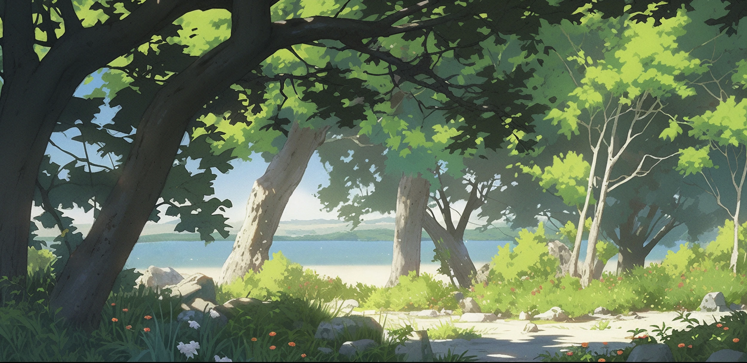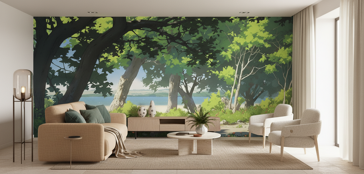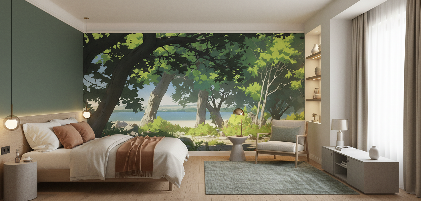 La palette chromatique de cette œuvre murale s’articule autour de tons naturels d’une richesse exceptionnelle : des verts tendres aux nuances émeraude se mêlent harmonieusement aux bleus apaisants du lac qui scintille au loin. Les touches de lumière dorée percent la frondaison, créant un jeu d’ombres et de clarté qui anime toute la composition. Quelques fleurs sauvages aux teintes orangées ponctuent délicatement le sous-bois, apportant une note de tendresse à cette fresque végétale.