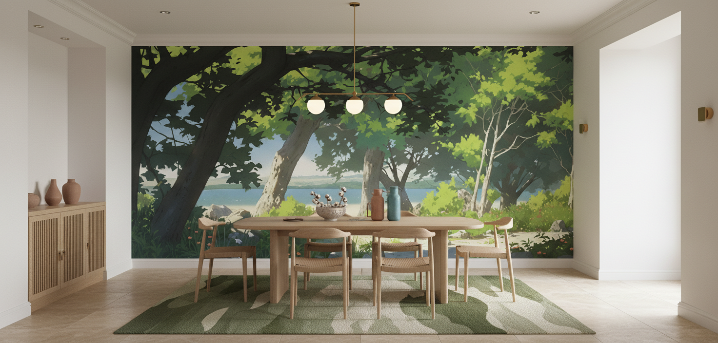 Pour sublimer cette fresque naturelle, associez-la à des matières authentiques comme le rotin, le jute ou la céramique artisanale. Des accessoires en laiton brossé et des plantes vertes complèteront parfaitement cette décoration biophilique, créant un ensemble harmonieux qui célèbre la beauté de la nature.