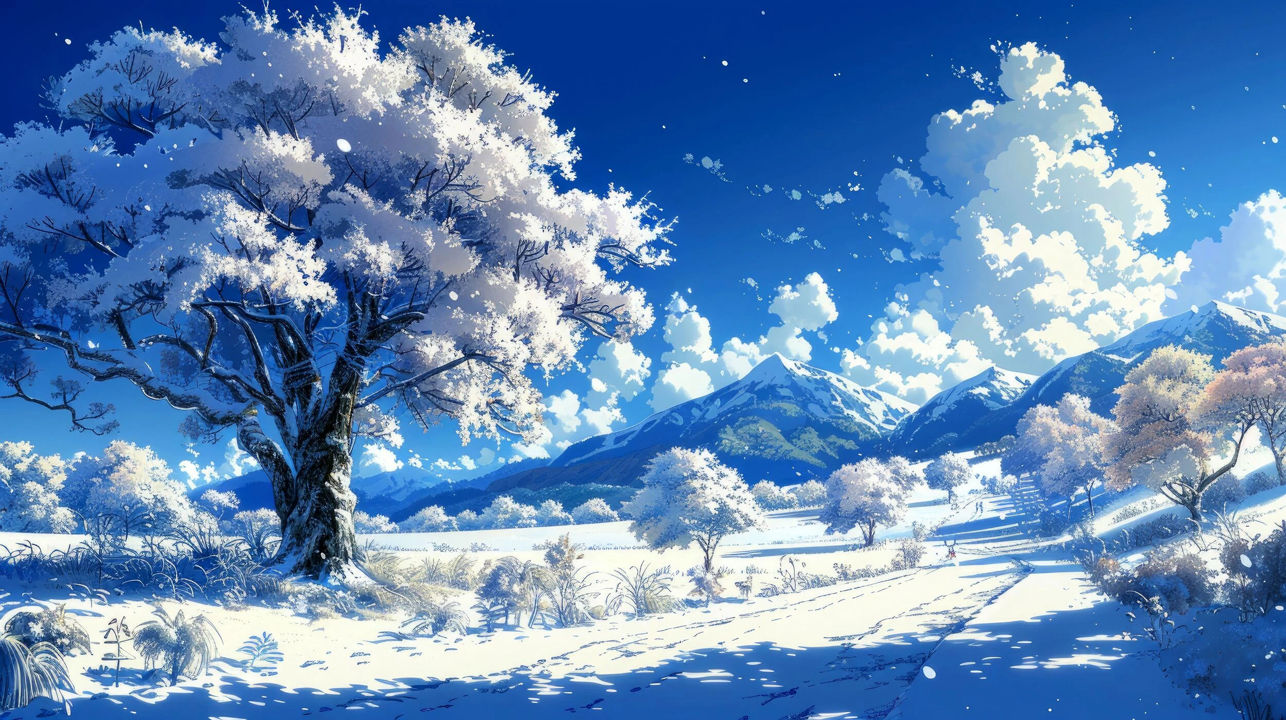 Cette fresque murale au style manga japonais raffiné capture l’essence d’un paysage enneigé avec une précision artistique remarquable. Au premier plan, un cerisier majestueux aux branches chargées de neige immaculée trône fièrement, ses ramures délicates se détachant contre l’immensité d’un ciel bleu profond. Les montagnes enneigées se dressent majestueusement en arrière-plan, leurs sommets acérés perçant les nuages blancs qui dansent dans l’atmosphère cristalline. La technique picturale évoque l’art de l’illustration numérique contemporaine, mêlant réalisme et poésie dans un rendu d’une finesse exceptionnelle.