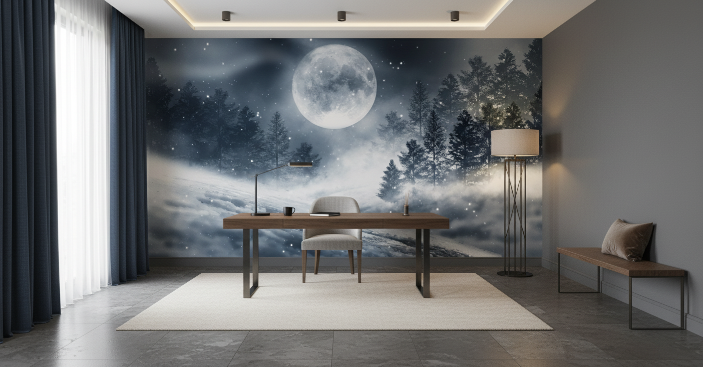 Idéal pour habiller le mur principal d’une chambre parentale, ce papier peint lune transformera votre espace nuit en sanctuaire romantique et apaisant. Dans un salon, il créera un point focal saisissant, particulièrement mis en valeur par un éclairage tamisé. Envisagez également son installation dans un bureau ou un coin lecture, où son atmosphère contemplative favorisera la concentration et l’inspiration. Pour sublimer cet univers hivernal, associez-le à du mobilier en bois brut aux teintes naturelles, des textiles en lin écru ou en laine bouclette, et des accessoires en métal brossé. Les tons blanc cassé, gris perle et beige naturel s’harmoniseront parfaitement avec cette palette hivernale, tandis que quelques touches de bleu nuit viendront faire écho à la profondeur du ciel étoilé.