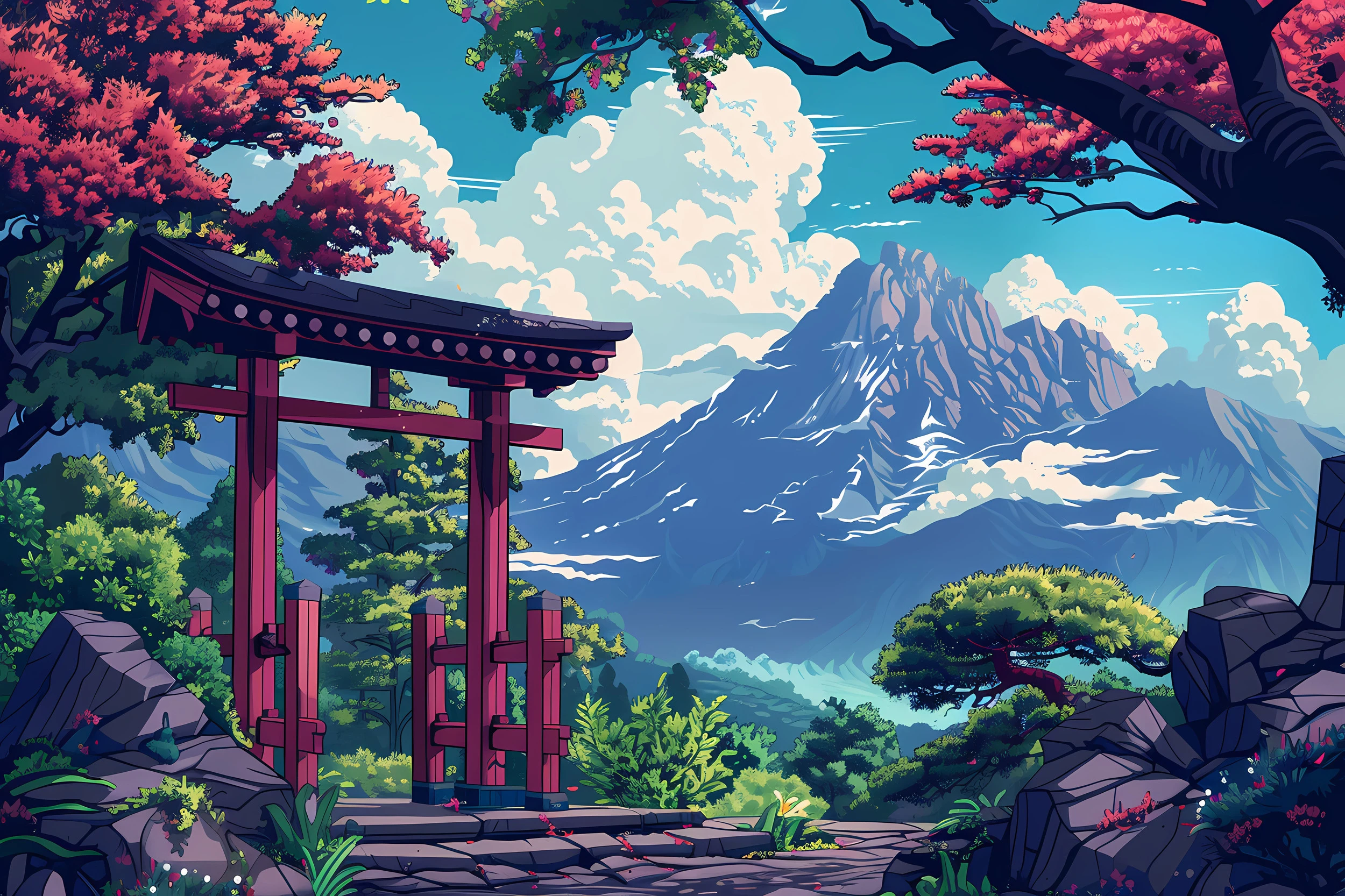 L’illustration digitale de style anime contemporain transforme cette scène en une véritable œuvre d’art murale. Les couleurs vives – du rouge profond du sanctuaire aux roses délicats des sakura, en passant par les bleus intenses du ciel et des montagnes – créent une harmonie chromatique d’une richesse exceptionnelle. Les détails minutieux, des pierres moussues aux branches entrelacées, témoignent d’un travail artistique remarquable.