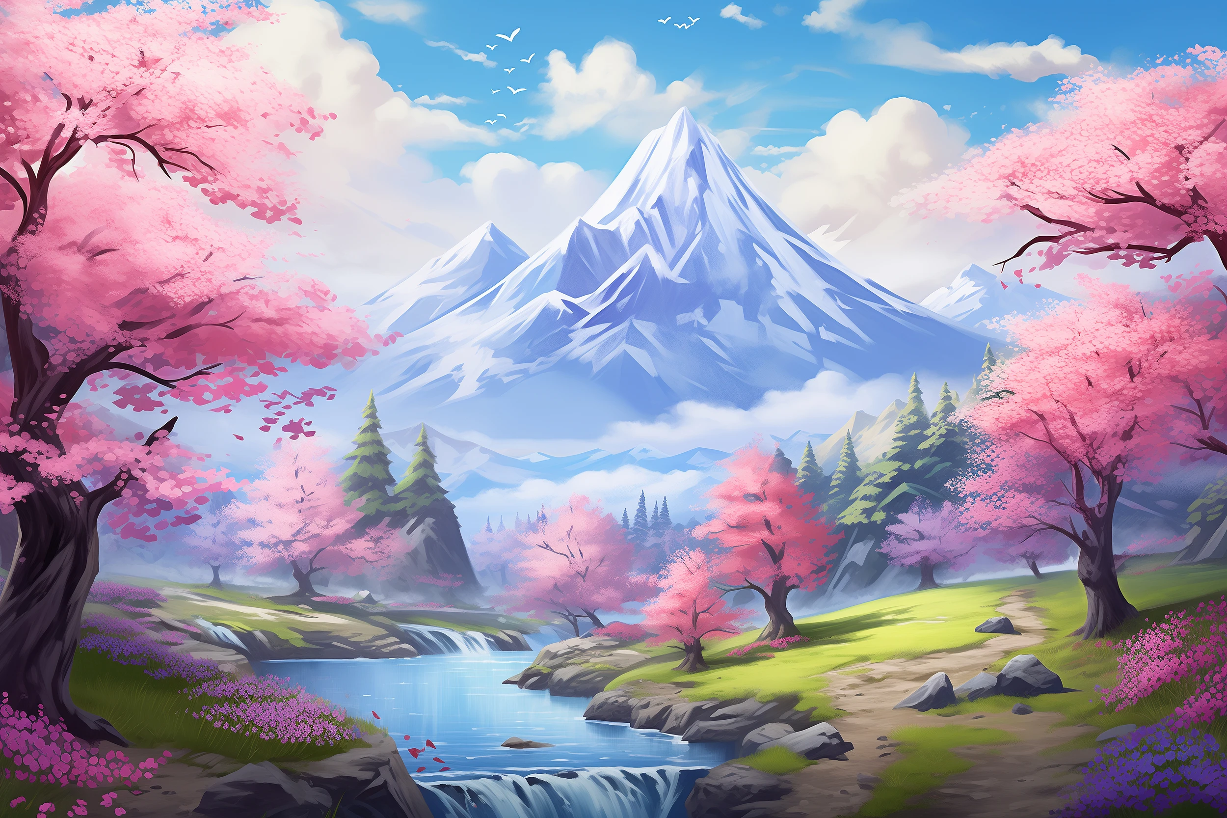 L’exécution artistique de ce papier peint style manga révèle un savoir-faire remarquable, mêlant la précision du dessin traditionnel japonais à une approche contemporaine. Les tons roses et bleus dominent cette œuvre décorative, créant une harmonie chromatique apaisante où se mélangent les nuances poudrées des fleurs de cerisier, le bleu profond des montagnes lointaines et le vert tendre des conifères. Un ruisseau cristallin serpente gracieusement à travers la scène, ajoutant une dimension dynamique à cette fresque murale d’inspiration orientale.
