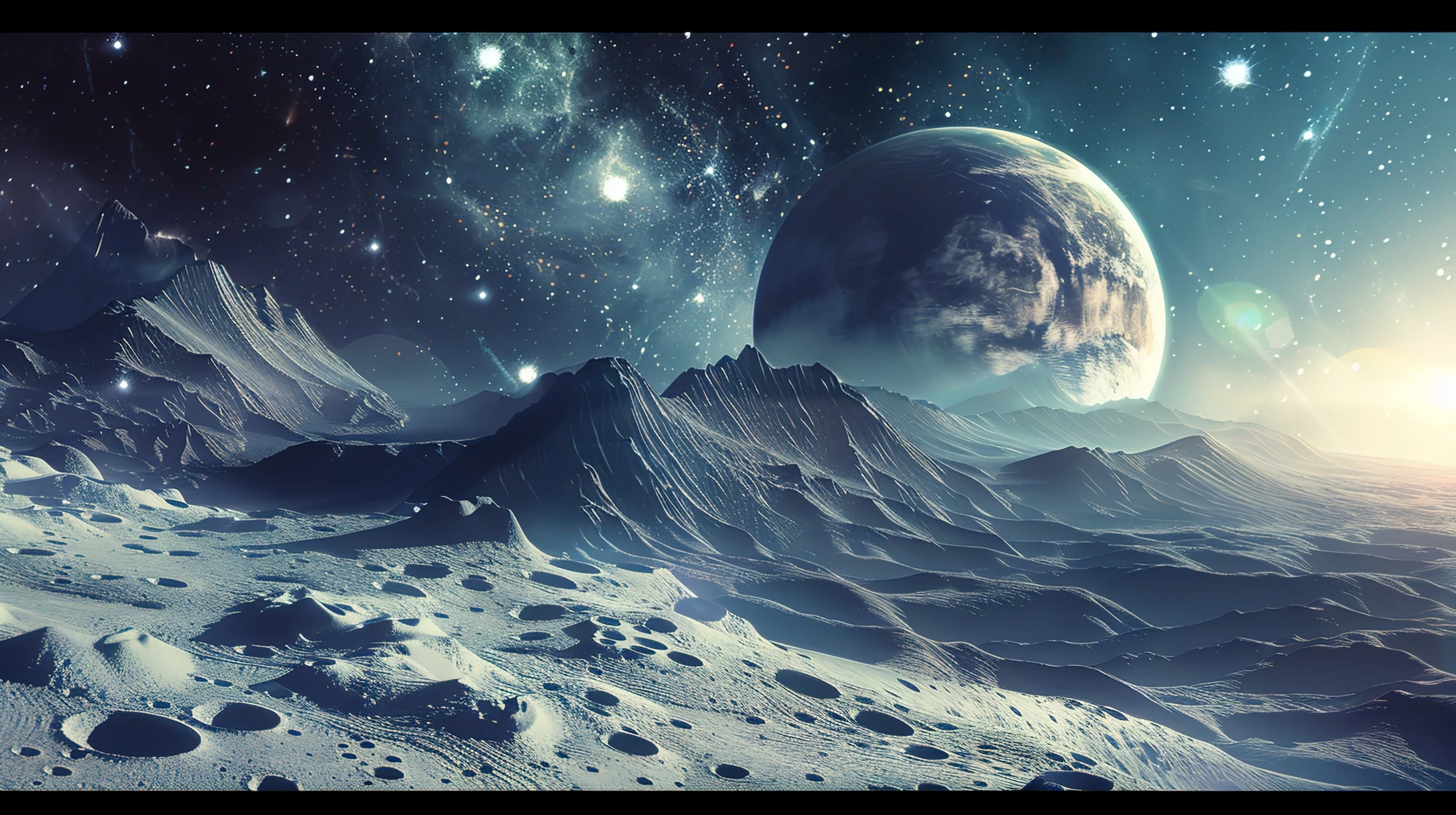 Laissez-vous transporter dans l’immensité silencieuse d’un monde extraterrestre, où la beauté glaciale des paysages lunaires rencontre la majesté infinie du cosmos étoilé.
