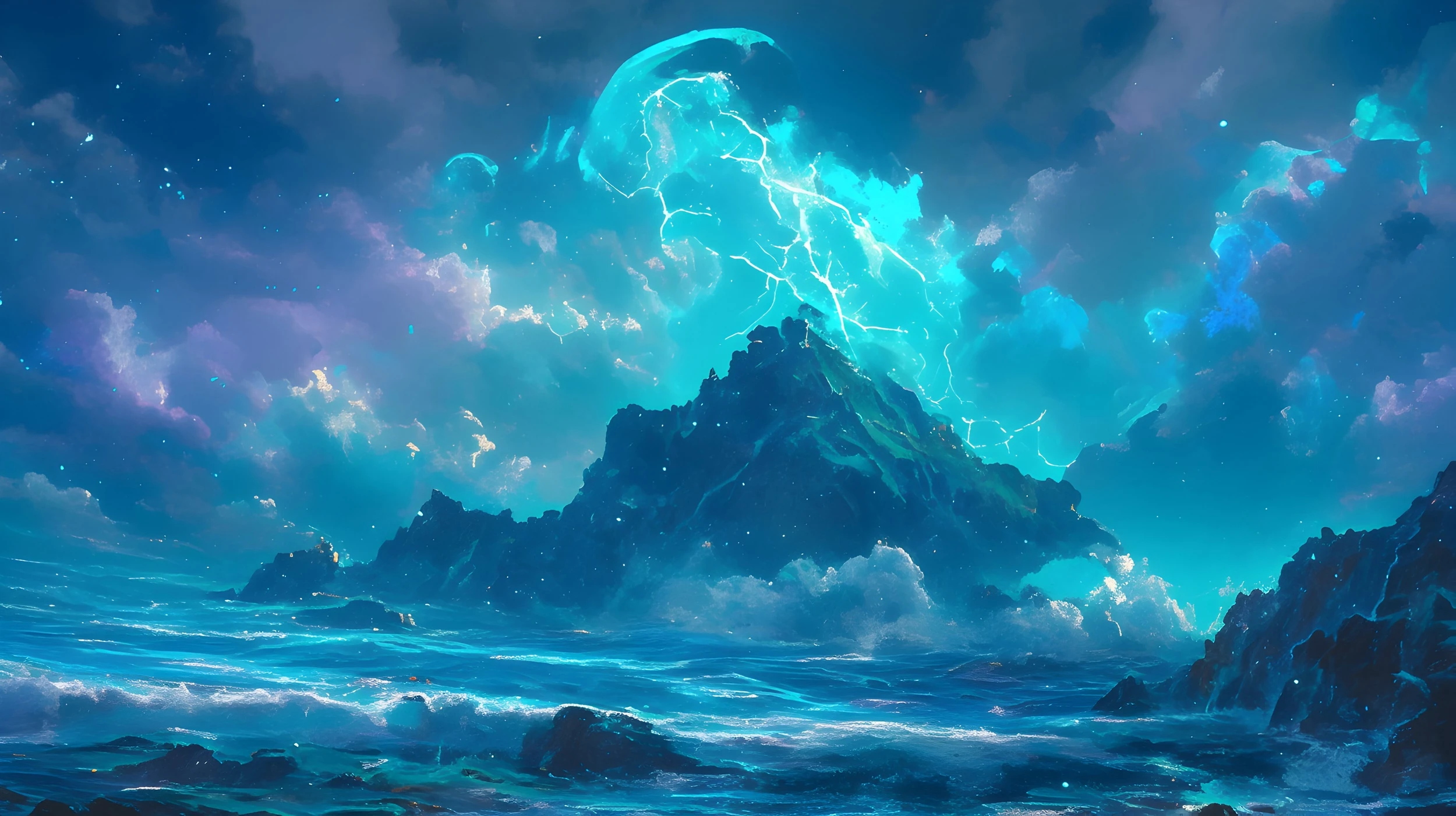 Ce papier peint paysage marin révèle une scène d’une puissance saisissante : des formations rocheuses mystérieuses émergent d’un océan tumultueux, tandis qu’au-dessus, un ciel orageux spectaculaire se pare d’éclairs lumineux aux reflets cyan. L’artiste a su capturer cette tempête fantastique dans un style de peinture numérique hyperréaliste, mêlant réalisme et onirisme. Les nuages volumineux aux nuances de bleu profond, turquoise électrique et violet nacré créent un contraste saisissant avec les rochers sombres qui percent la surface marine. Les vagues écumantes aux reflets bleu azur apportent une dynamique constante à cette composition majestueuse.