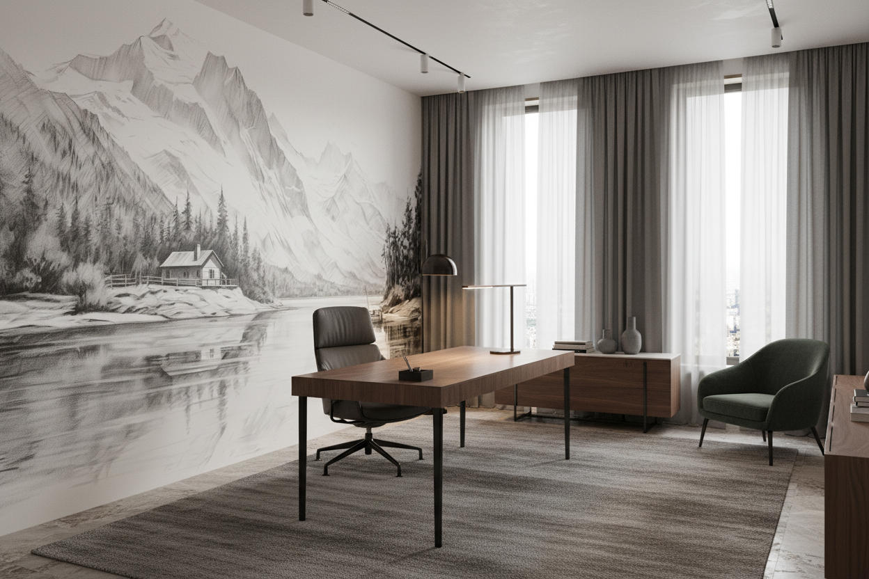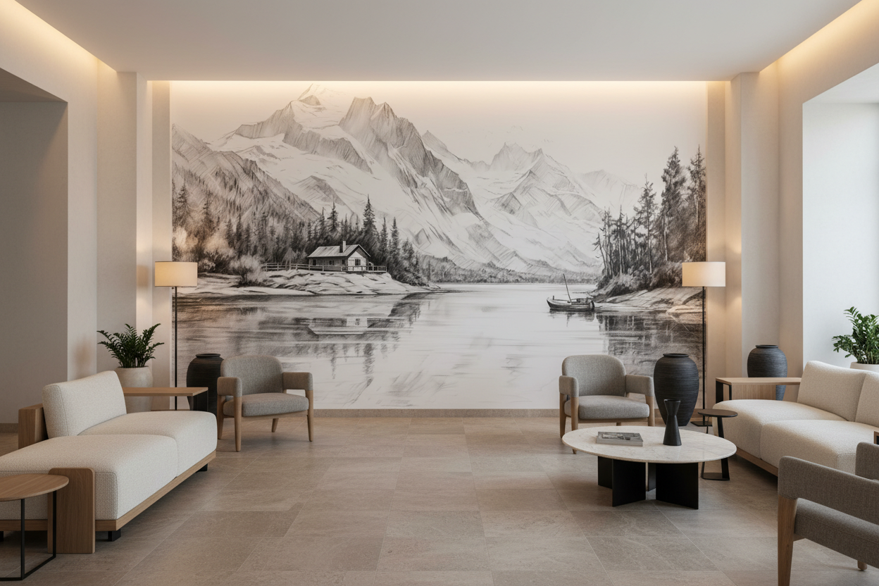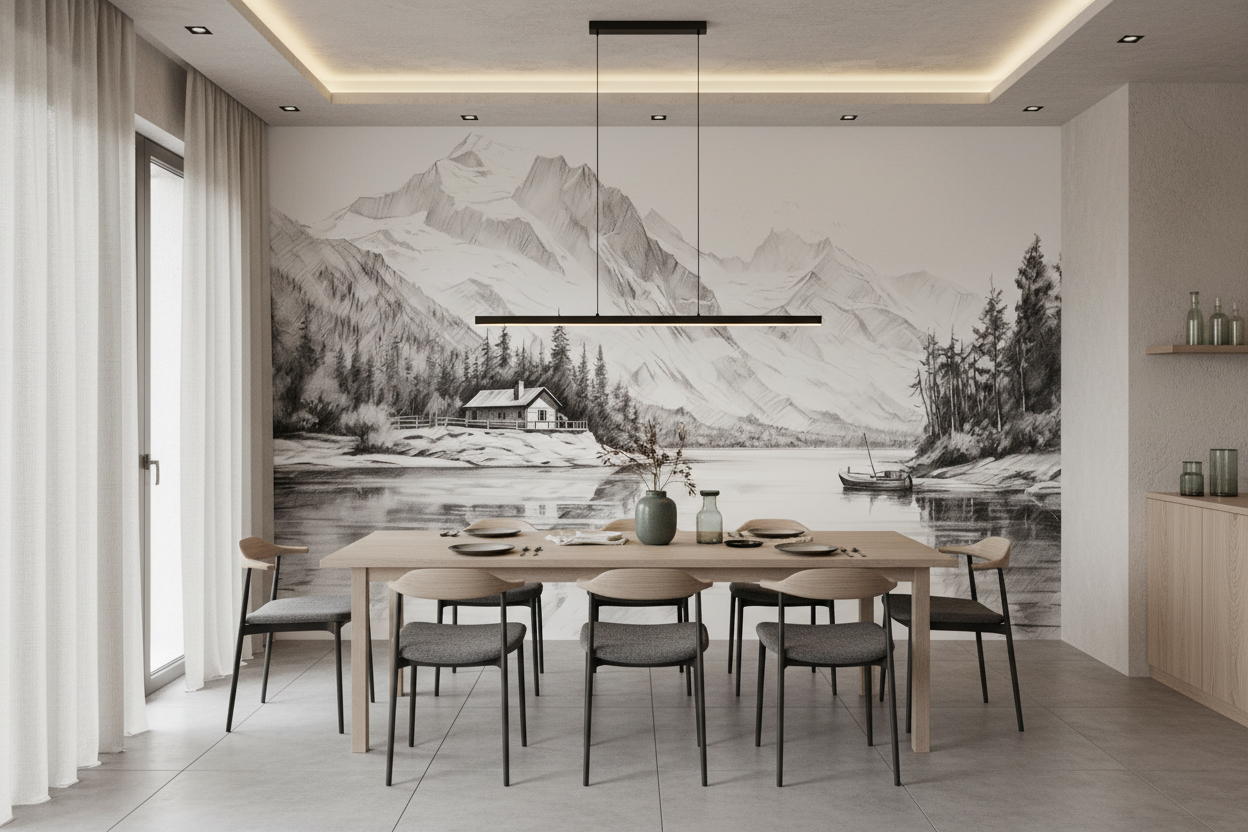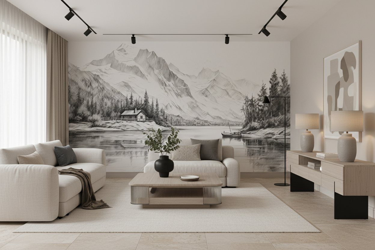 Ce papier peint lac et montagne trouve sa place idéale dans un salon cosy où il habillera le mur principal avec distinction, créant un point focal saisissant. Dans une chambre parentale, il transformera l’espace en refuge romantique, particulièrement sublime derrière la tête de lit. Un bureau bénéficiera également de cette échappée visuelle, favorisant concentration et créativité. Pour magnifier cette ambiance chalet scandinave, associez-le à du mobilier en bois brut, des textiles en lin naturel et des touches de laiton patiné. Les couleurs complémentaires idéales incluent les tons crème, le gris anthracite et les verts sauge pour créer une harmonie parfaite avec cette esthétique montagnarde raffinée.