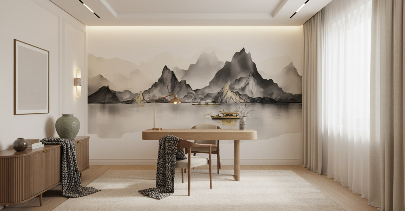Ce papier peint style japonisant trouve naturellement sa place dans un salon zen, où il sublimera un mobilier aux lignes épurées en bois de teck ou en bambou naturel. Dans une chambre parentale, il créera une ambiance propice au repos et à la sérénité, particulièrement mis en valeur par des textiles en lin écru et des luminaires en papier de riz. Un bureau habillé de cette fresque murale devient un espace de concentration idéal, favorisant créativité et réflexion.