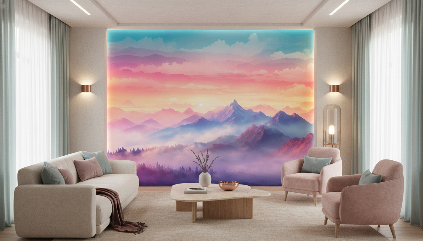 Ce papier peint décoratif trouve sa place idéale dans une chambre parentale, où il créera une ambiance propice au repos et à la relaxation. Il sublimera également un salon moderne, particulièrement derrière un canapé en lin naturel ou en velours gris perle. Dans un bureau, il favorisera la concentration tout en apportant une touche d’évasion bienvenue. Pour magnifier son effet, associez-le à du mobilier en bois clair, des textiles dans les tons crème ou beige rosé, et des touches de laiton doré. Les plantes vertes, particulièrement les espèces aux feuillages graphiques, créeront un contraste saisissant avec les teintes pastel du motif.