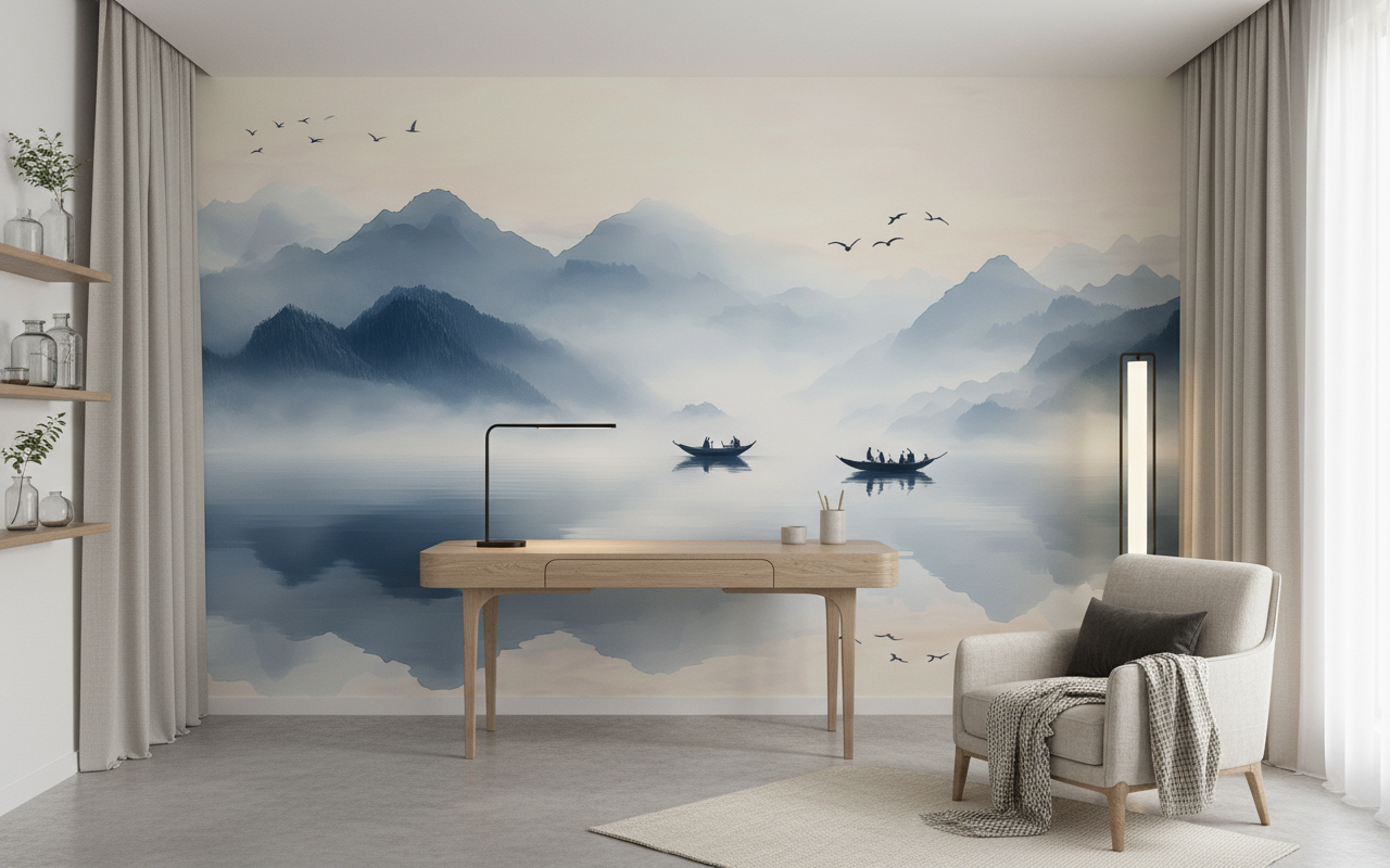 Ce papier peint paysage zen capture avec une délicatesse infinie l’essence d’un matin oriental, où la brume matinale enveloppe des montagnes en cascade dans un camaïeu de bleus poudrés et de gris nacrés. Au premier plan, deux embarcations traditionnelles glissent silencieusement sur les eaux parfaitement lisses, leurs silhouettes se reflétant comme des ombres chinoises sur la surface cristalline. Des oiseaux migrateurs traversent le ciel d’un rose tendre et crème, ajoutant une note de vie contemplative à cette composition d’une sérénité absolue.