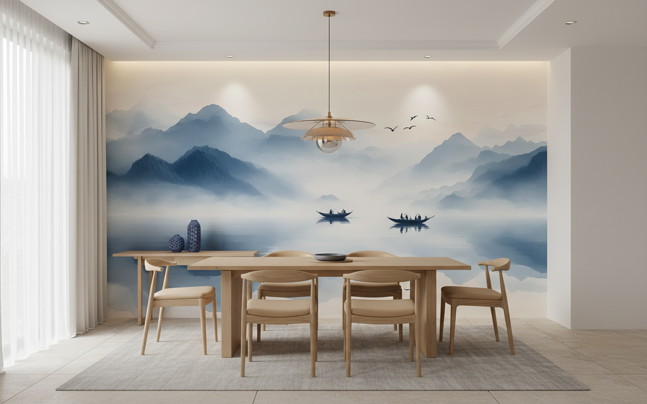 Associez ce papier peint bleu et gris à un mobilier en bois clair – chêne blanchi, bambou ou teck naturel – pour renforcer l’harmonie zen. Des accessoires en céramique blanche, des textiles naturels dans des tons beige rosé et gris tourterelle, ainsi que quelques plantes vertes aux lignes épurées complèteront parfaitement cette décoration d’inspiration asiatique. L’éclairage tamisé, avec des lampes en papier de riz ou des appliques discrètes, sublimera les nuances délicates de cette fresque panoramique.