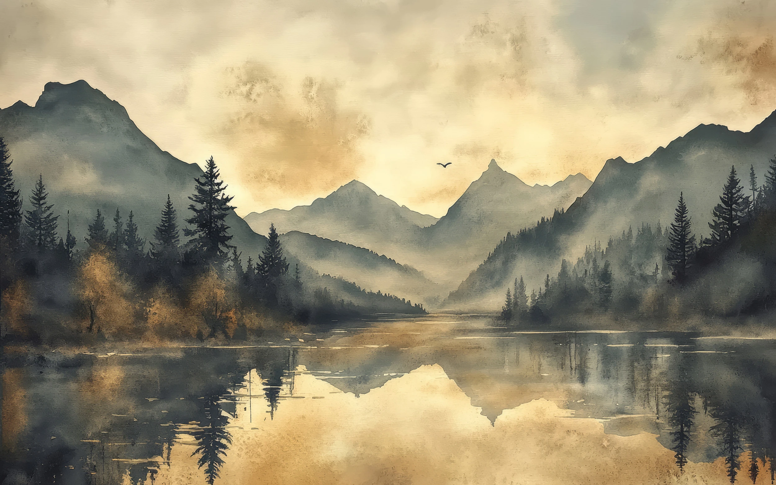 Cette œuvre décorative révèle un paysage de montagne d’une beauté saisissante, où se dessinent des pics majestueux noyés dans une brume vaporeuse. Au premier plan, un lac paisible reflète parfaitement les nuages dorés et les silhouettes des conifères qui bordent ses rives. La technique aquarelle employée confère à l’ensemble une douceur poétique, jouant sur les transparences et les dégradés subtils. Les tons sépia et ocre dominent cette composition, rehaussés par des nuances de gris-bleu qui évoquent la fraîcheur montagnarde. Un oiseau solitaire traverse le ciel, ajoutant une note de vie à cette scène contemplative. La forêt de sapins se dresse en sentinelles silencieuses, créant un cadre naturel d’une authenticité remarquable.
