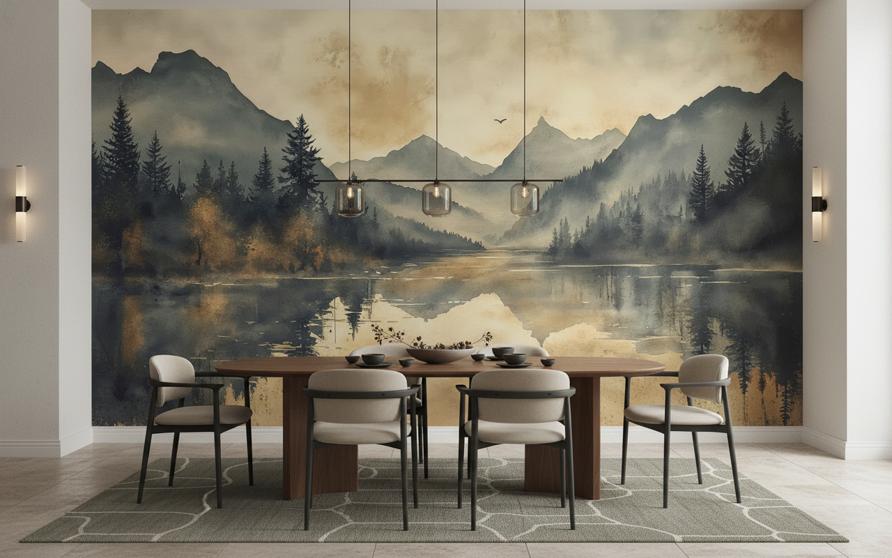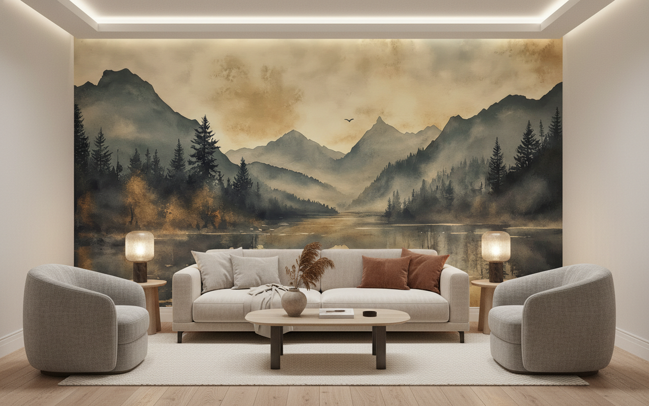 Parfaitement adapté pour sublimer un salon zen ou une chambre parentale, ce papier peint panoramique trouve également sa place dans un bureau où il favorise la concentration. Dans une chambre d’enfant, il stimule l’imagination tout en créant une atmosphère rassurante. Associez-le à du mobilier en bois naturel, des textiles en lin écru et des accessoires en laiton vieilli pour accentuer son caractère authentique. Les tons neutres et les matières brutes comme la pierre ou le rotin complètent harmonieusement cette esthétique style scandinave aux accents montagnards.