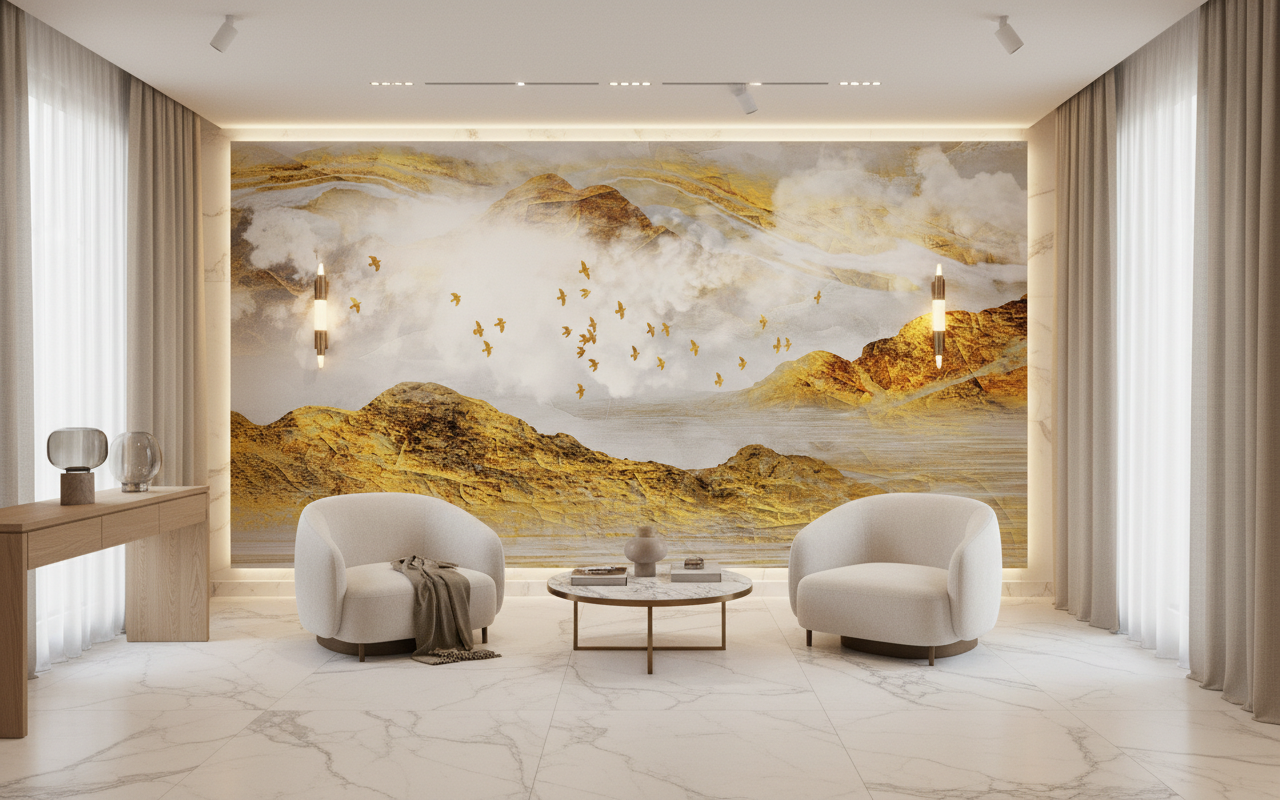 Ce papier peint paysage montagnard révèle une composition artistique d’une rare sophistication, mêlant technique de peinture à l’encre et effets d’aquarelle dans un style contemporain épuré. Les montagnes dorées se dressent avec noblesse, leurs reliefs texturés évoquant la pierre précieuse et le métal en fusion. La palette chromatique, dominée par les tons dorés, les ocres chaleureux et les blancs nacrés, crée une harmonie visuelle apaisante et luxueuse. Une nuée d’oiseaux stylisés traverse cette scène panoramique, apportant une dimension poétique et un mouvement gracieux à l’ensemble. Les effets de brume et les nuages vaporeux confèrent une profondeur mystérieuse à cette œuvre murale, rappelant les peintures chinoises traditionnelles revisitées dans un esprit moderne.