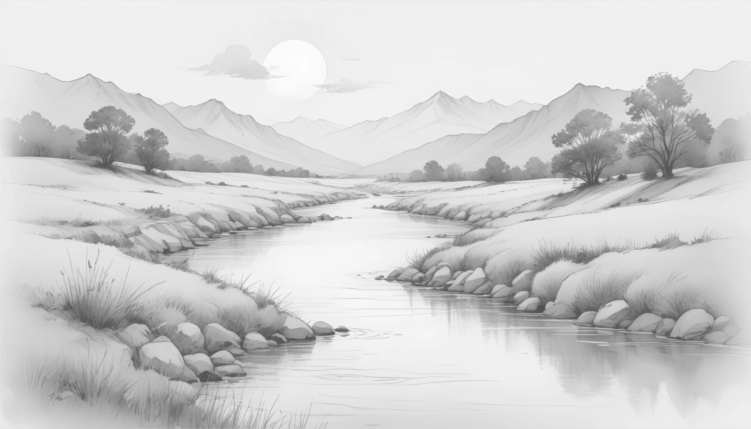 Ce papier peint paysage dévoile une composition d’une rare délicatesse, réalisée dans un style dessin au trait monochrome qui évoque l’art de l’aquarelle en noir et blanc. Au premier plan, une rivière sinueuse serpente gracieusement entre des berges parsemées de galets arrondis et d’herbes folles qui dansent au gré d’une brise imaginaire. Les montagnes majestueuses se dressent en arrière-plan, créant un relief naturel aux courbes douces et harmonieuses, tandis que des arbres aux silhouettes élancées ponctuent le paysage de leur présence protectrice. Le ciel nuageux, traversé de nuances grises subtiles, apporte une profondeur atmosphérique remarquable à cette scène bucolique.