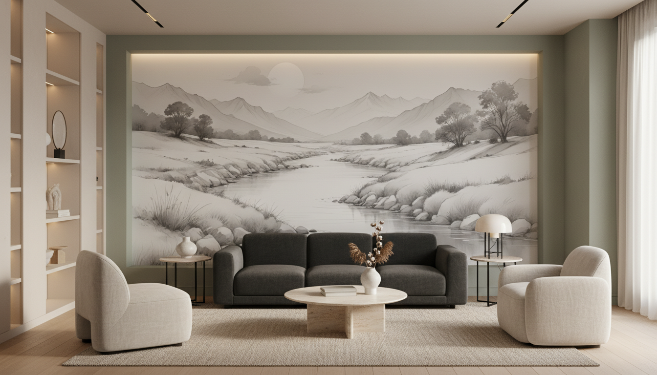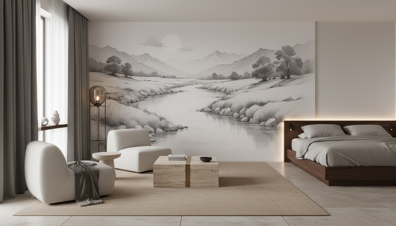 Ce papier peint panoramique trouvera sa place idéale dans un salon zen où il constituera un point focal élégant, créant une fenêtre virtuelle vers la nature. Il sublimera également une chambre parentale en apportant cette douceur propice au repos, ou transformera un bureau en espace de travail inspirant. Pour magnifier son effet, associez-le à du mobilier en bois naturel, des textiles en lin écru ou coton blanc, et quelques touches de matières brutes comme la céramique artisanale ou le rotin tressé. Les teintes neutres – beige, taupe, blanc cassé – s’harmoniseront parfaitement avec cette palette monochrome, tandis que des accents de vert sauge rappelleront subtilement la végétation du paysage.