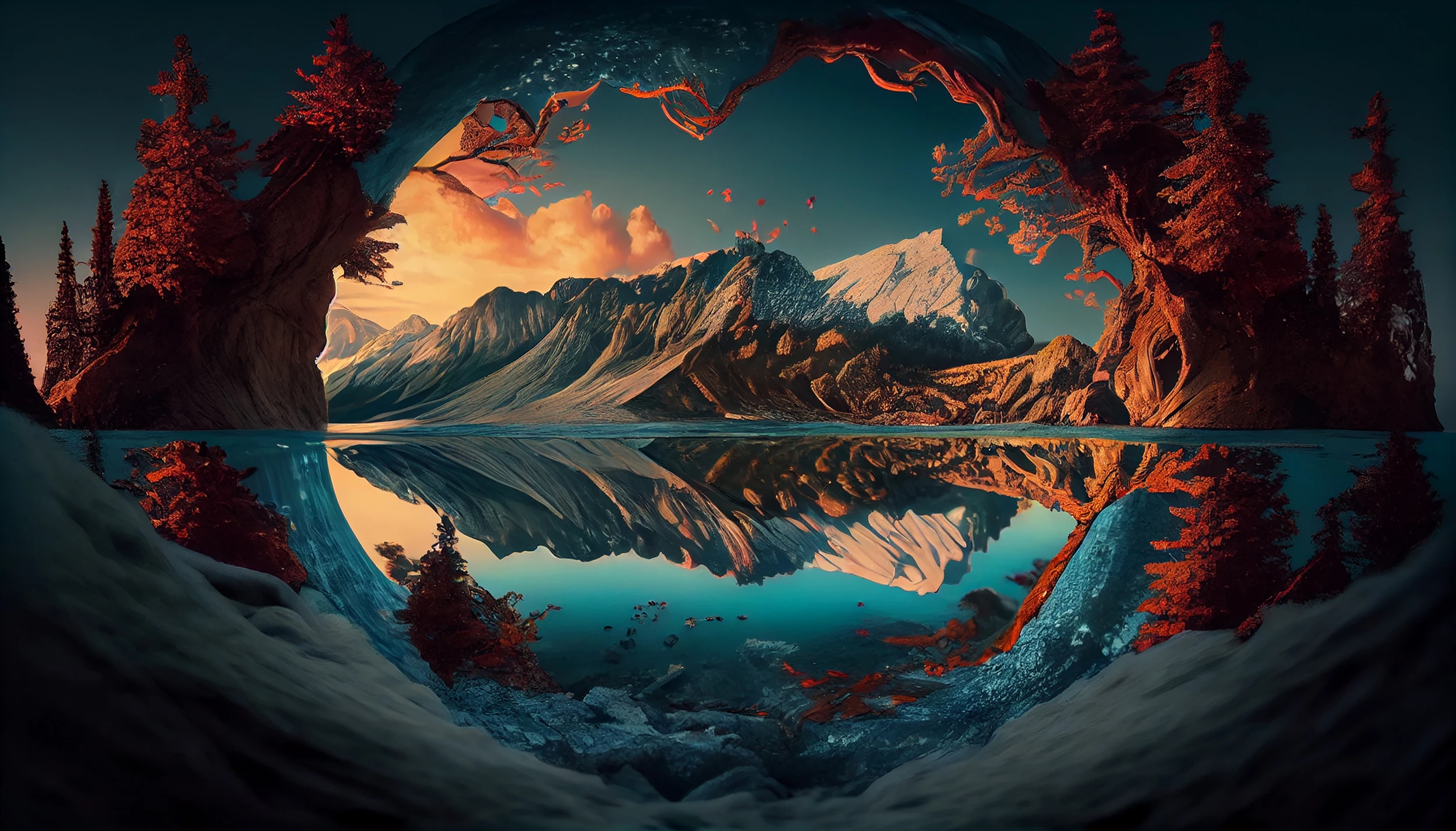 L’encadrement naturel formé par des arbres aux feuillages rouge-orangé apporte une dimension théâtrale à cette composition. Ces conifères stylisés aux teintes automnales créent un contraste saisissant avec les tons froids des montagnes et de l’eau. Le style graphique, d’inspiration romantique moderne, évoque les plus belles œuvres de la peinture de paysage contemporaine, avec des effets de lumière dorée qui transforment cette scène naturelle en véritable tableau d’art mural.