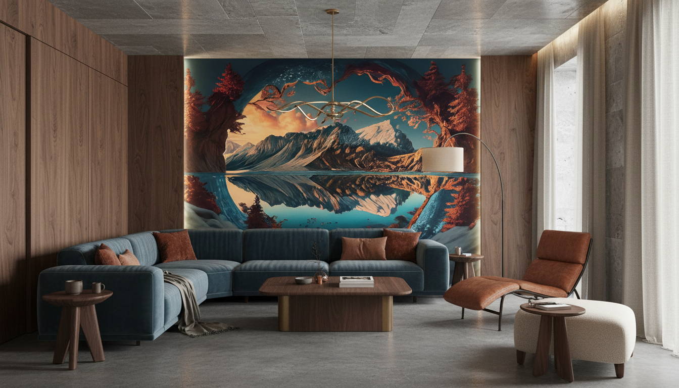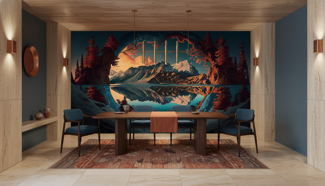 La palette chromatique de ce papier peint nature oscille entre les bleus profonds, les ocres chaleureux et les rouges cuivrés, créant une harmonie coloriste d’une richesse exceptionnelle. Les nuages dramatiques dans des tons de pêche et d’orange ajoutent une dimension poétique, suggérant un coucher de soleil éternel figé dans le temps.