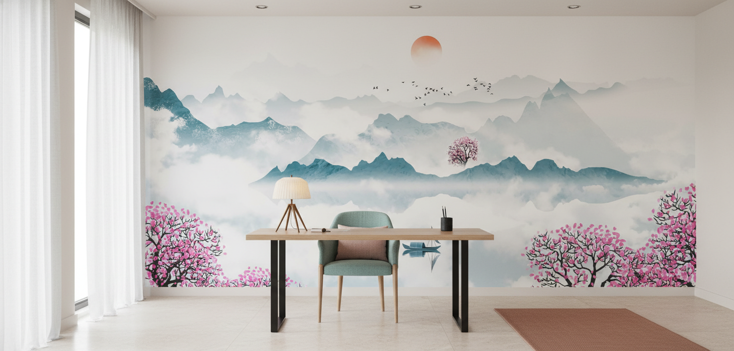 Ce papier peint paysage asiatique déploie avec une grâce infinie l’art délicat de la peinture à l’aquarelle traditionnelle. Les montagnes brumeuses se succèdent en couches vaporeuses, créant une profondeur saisissante grâce aux nuances de bleu-vert qui s’estompent graduellement vers l’horizon. Au premier plan, de magnifiques cerisiers en fleurs déploient leurs branches chargées de pétales roses délicats, encadrant la composition avec une tendresse printanière. Au cœur de cette symphonie visuelle, une barque solitaire glisse silencieusement sur les eaux calmes, reflétant parfaitement la sérénité du moment. Un vol d’oiseaux migrateurs ponctue le ciel d’un ballet gracieux, tandis qu’un soleil orangé nimbe l’ensemble d’une lumière douce et apaisante.