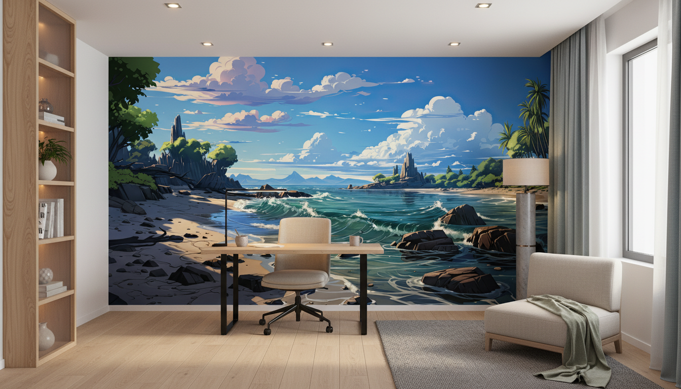 L’illustration digitale adopte un style semi-réaliste aux accents anime, mariant la précision du détail à la poésie de l’imaginaire. Les couleurs vives et saturées orchestrent une symphonie visuelle où dominent les bleus océaniques, les verts émeraude de la jungle et les tons chauds du sable. Les reflets nacrés sur l’eau et les jeux d’ombre et de lumière confèrent à cette fresque murale une profondeur et un dynamisme exceptionnels.