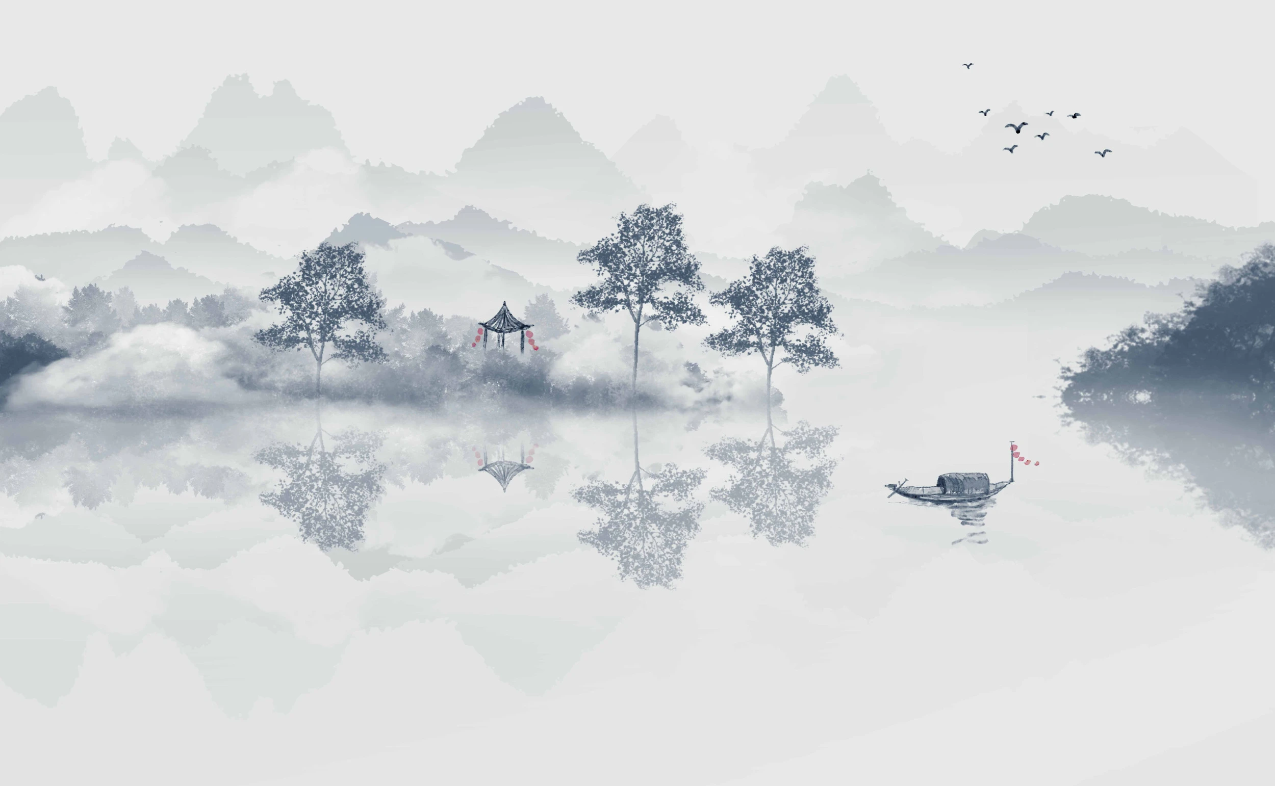 Cette œuvre murale d’exception révèle un paysage aquatique empreint de poésie orientale, où se dessinent avec délicatesse les silhouettes élancées d’arbres centenaires émergeant de la brume. Au centre de cette composition harmonieuse, un pavillon traditionnel asiatique aux lignes épurées s’élève gracieusement, paré de touches carmin qui ponctuent la douceur monochrome. Une embarcation de pêcheur solitaire glisse silencieusement sur les eaux miroir, tandis qu’un vol d’oiseaux esquisse une chorégraphie aérienne dans le ciel nacré. Le style graphique s’inspire des techniques d’aquarelle traditionnelle chinoise, mêlant encre de Chine et lavis subtils pour créer cette atmosphère contemplative. La palette chromatique joue sur une harmonie de gris perle et de blanc cassé, rehaussée de quelques accents rouge vermillon qui apportent une note de vie à cette symphonie monochrome.
